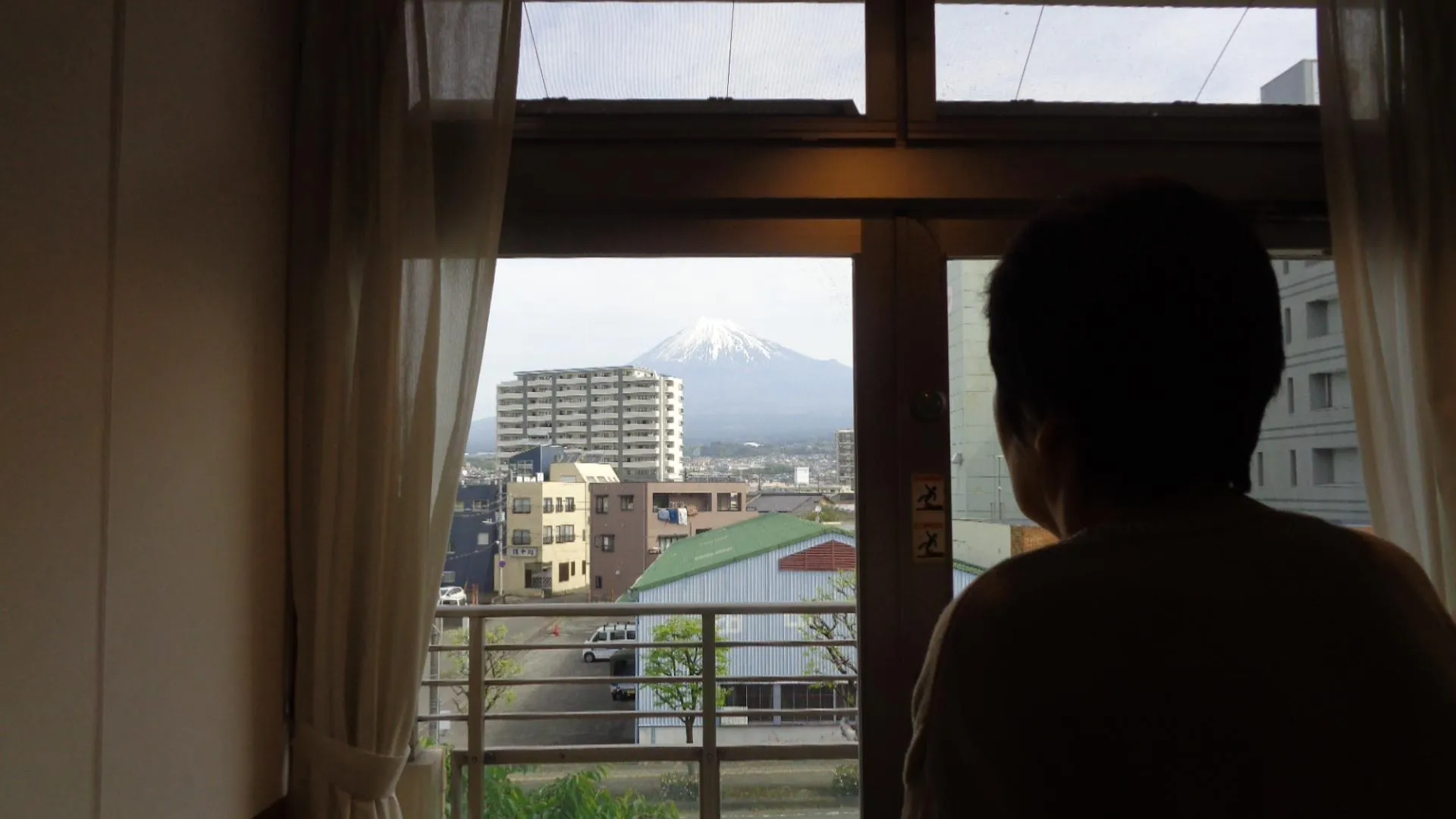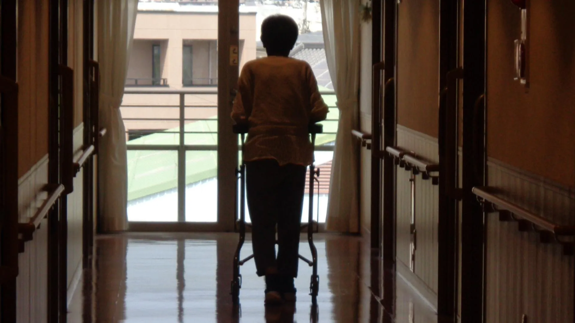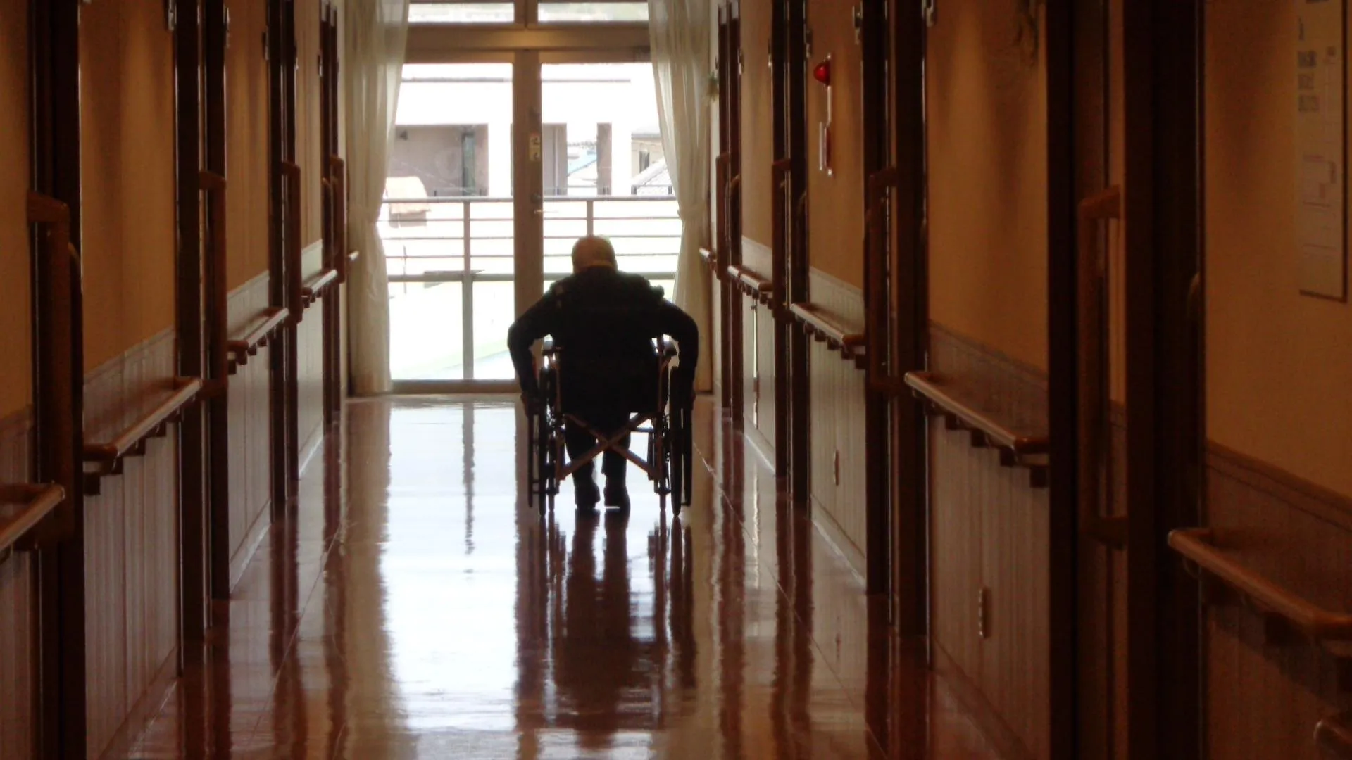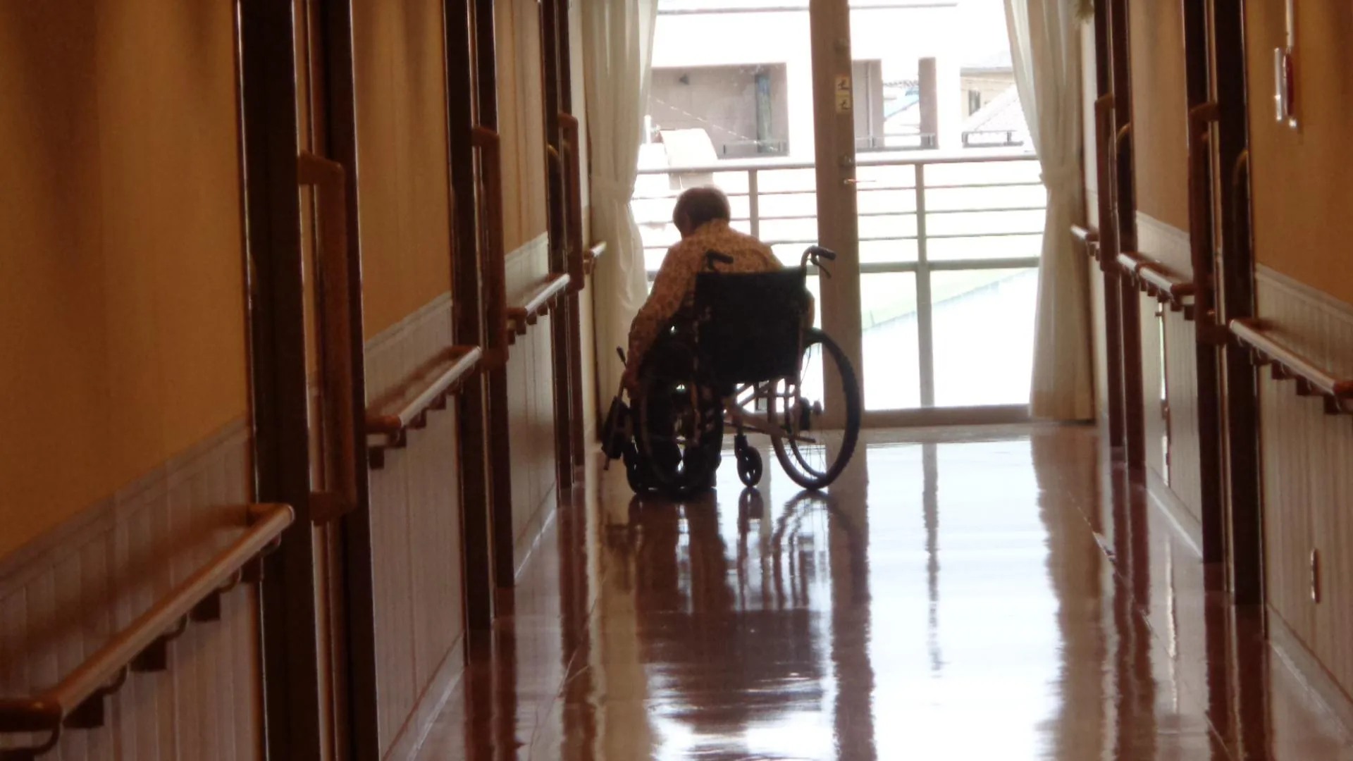 私たちの施設は、フロアや廊下の形は同じです。お客様は日々、車椅子で自走したり歩行器使って歩行したりしています。また機能訓練士と一緒に筋力アップのために、手すりを使って足踏みしています。窓から富士山が綺麗に見えています。