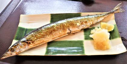 お皿からはみでるほどの立派な秋刀魚をご覧ください。脂ものった、おいしい秋刀魚は大好評でした。