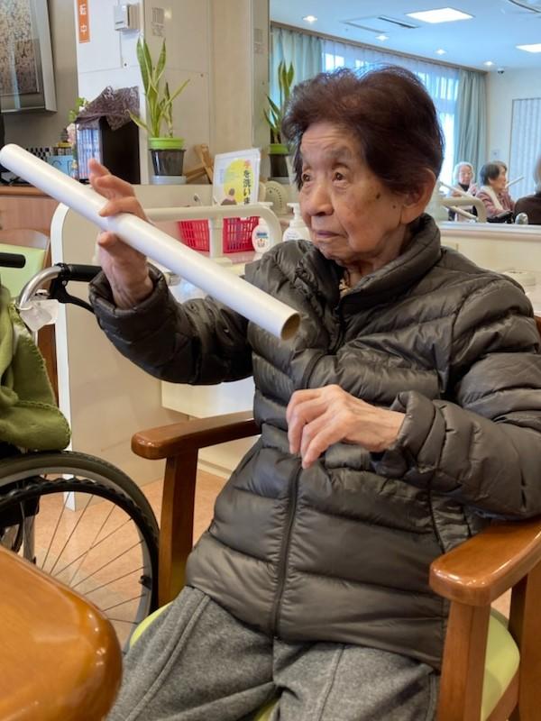 本日2階では、全体体操を行っています。機能訓練指導員(柔道整復師)による体操です。今日は身近にあるラップの芯を使用しての体操を行いました。バランス及び関節可動域訓練を行いました。