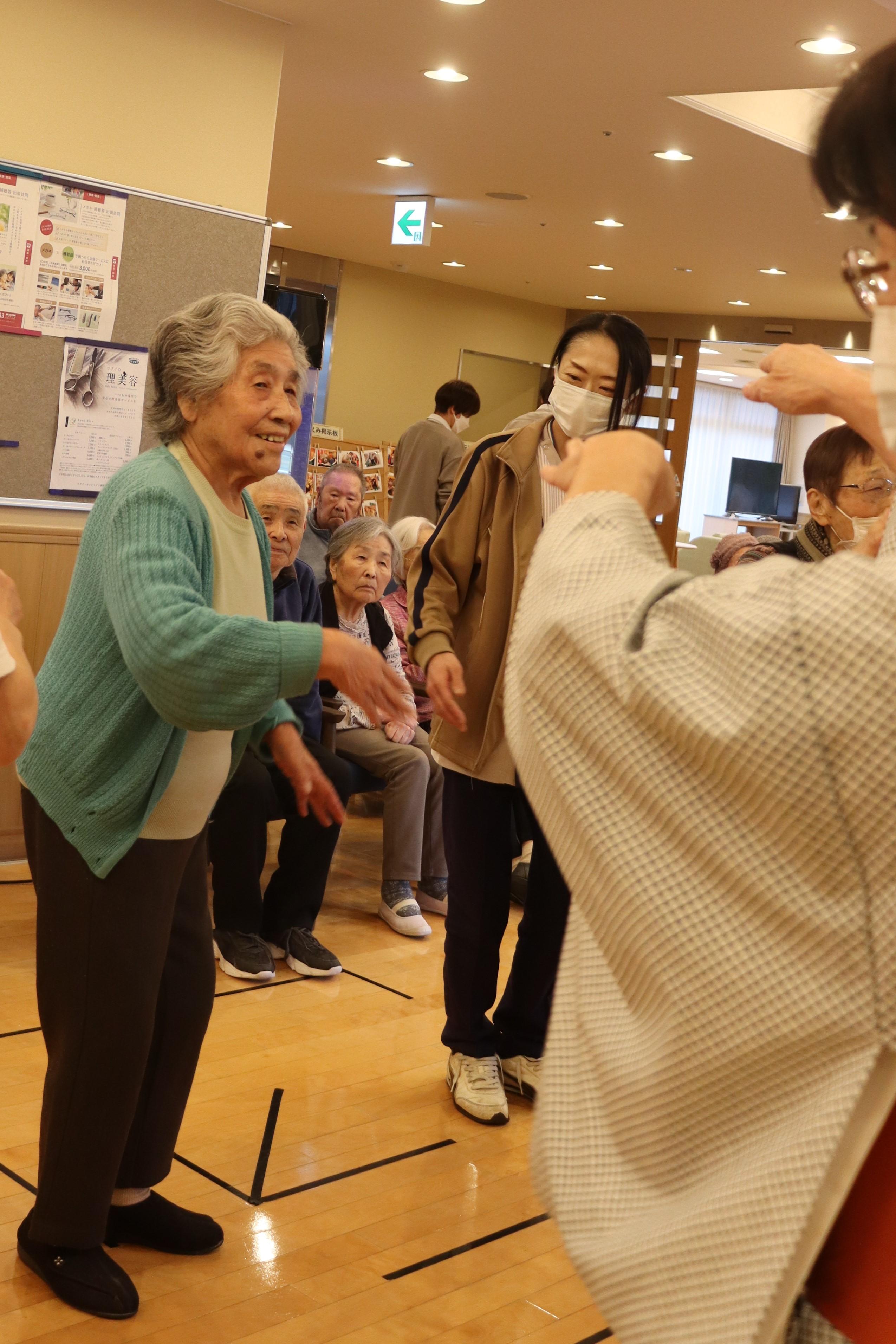 車椅子の方も、立位可能な方も、少しでも身体を動かして頂こうとただ見るだけではなく、手だけもしくは一緒に踊って頂くよう声掛けしております。
