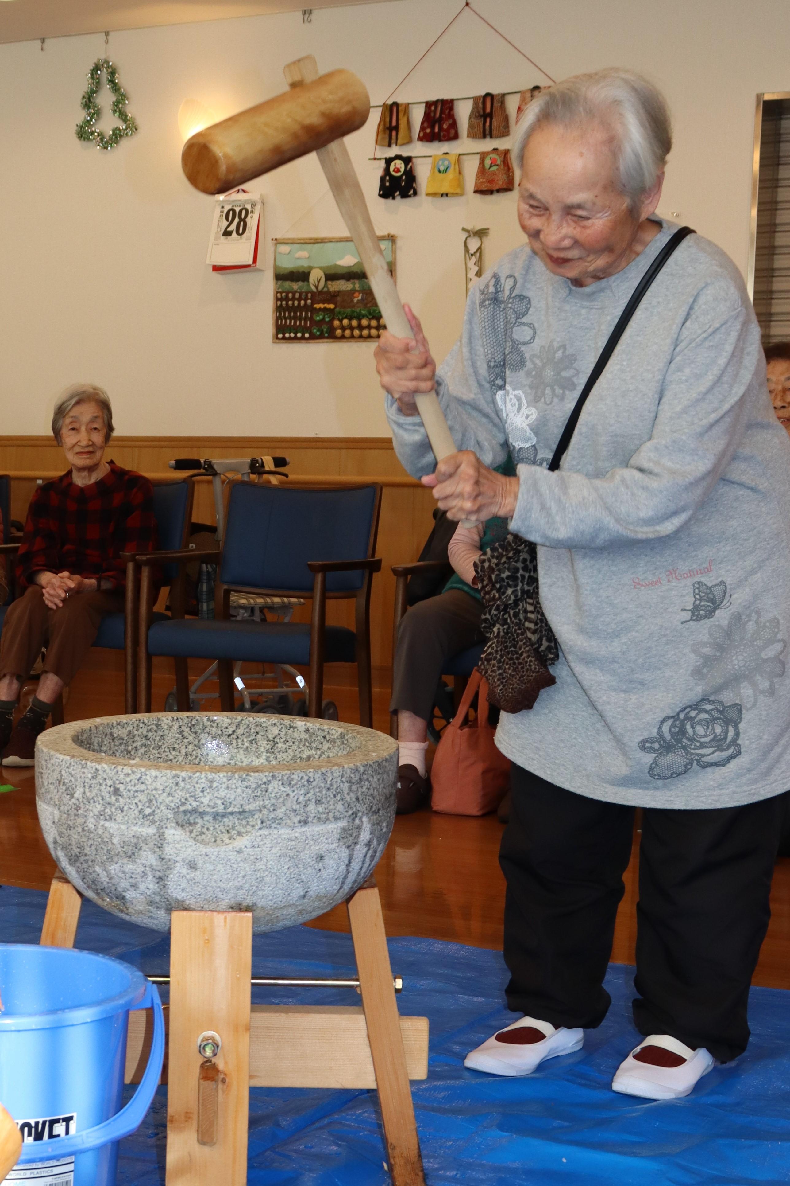 昔は皆様ご自宅で行われていたかと思いますが、最近は餅つき機で行う事が多いですよね?実際に杵で皆様について頂き、懐かしがられています。