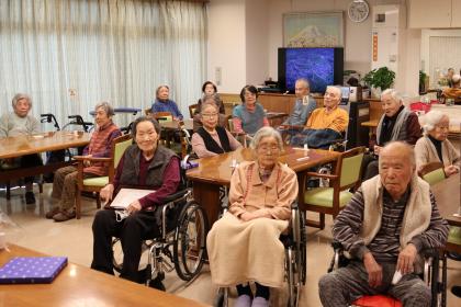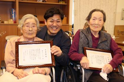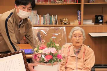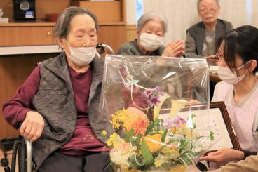 1月に施設内で100歳を迎えられた方が2名いらっしゃいます。2名の方へツクイから、また施設からお祝いのプレゼントをお渡しし、皆様でお祝いしています。