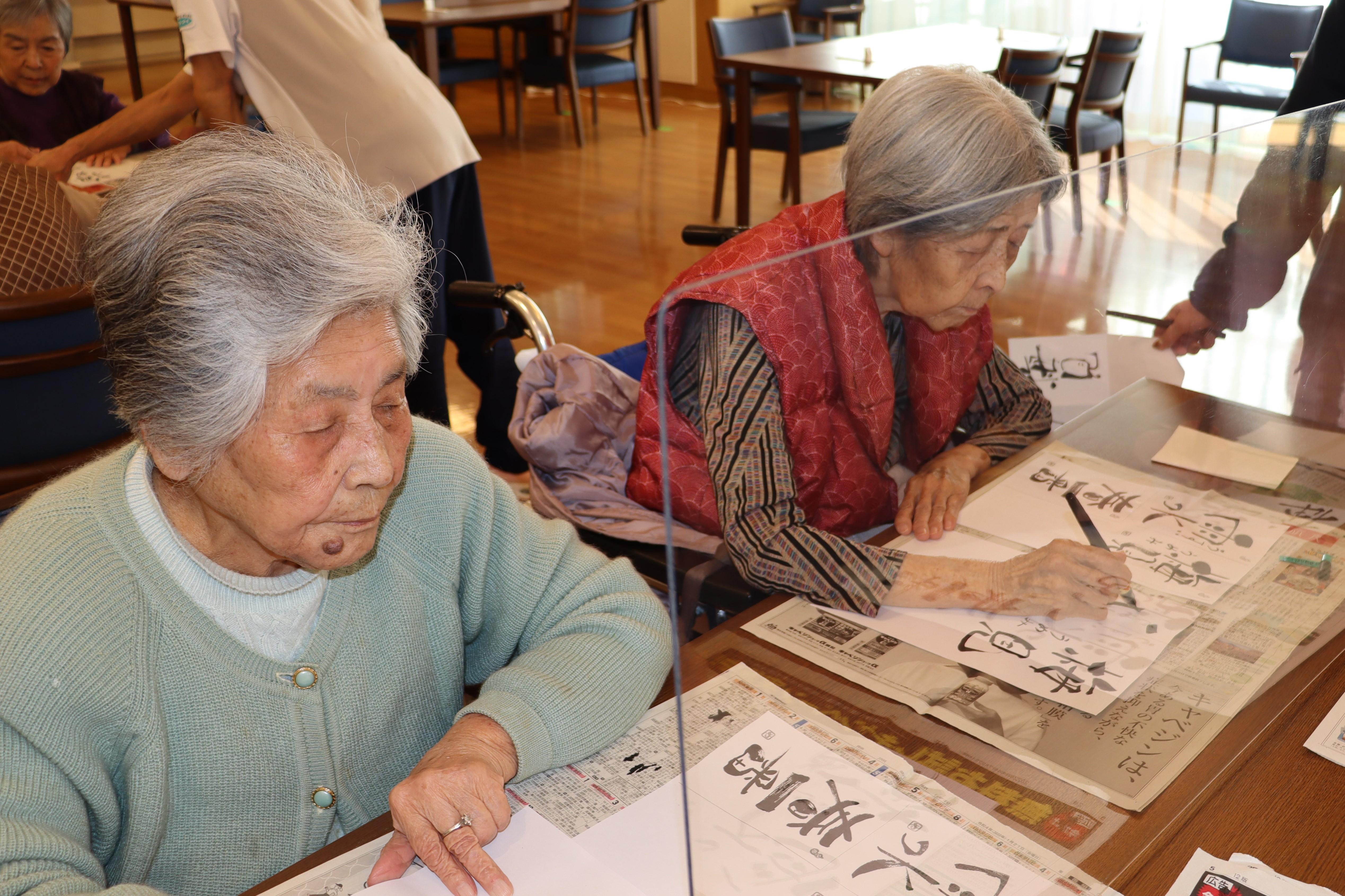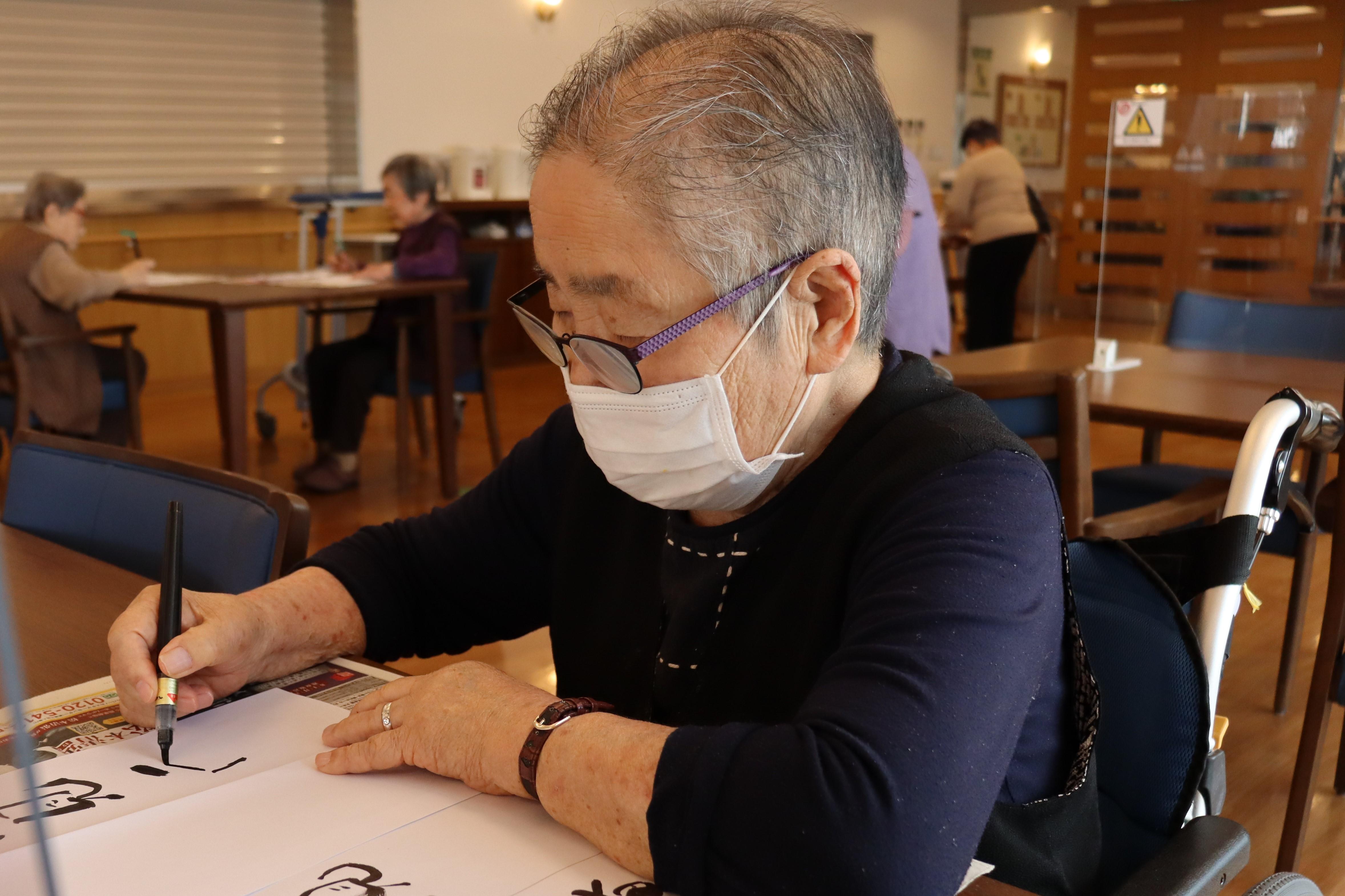 己書を行っています。筆ペンを使用し、皆様思い思いに字を…のはずですが、やはりお手本があるとお手本通りに書いてしますね。ただ、講師も「楽しみながら」をモットーに教えて下さってますので、問題です。