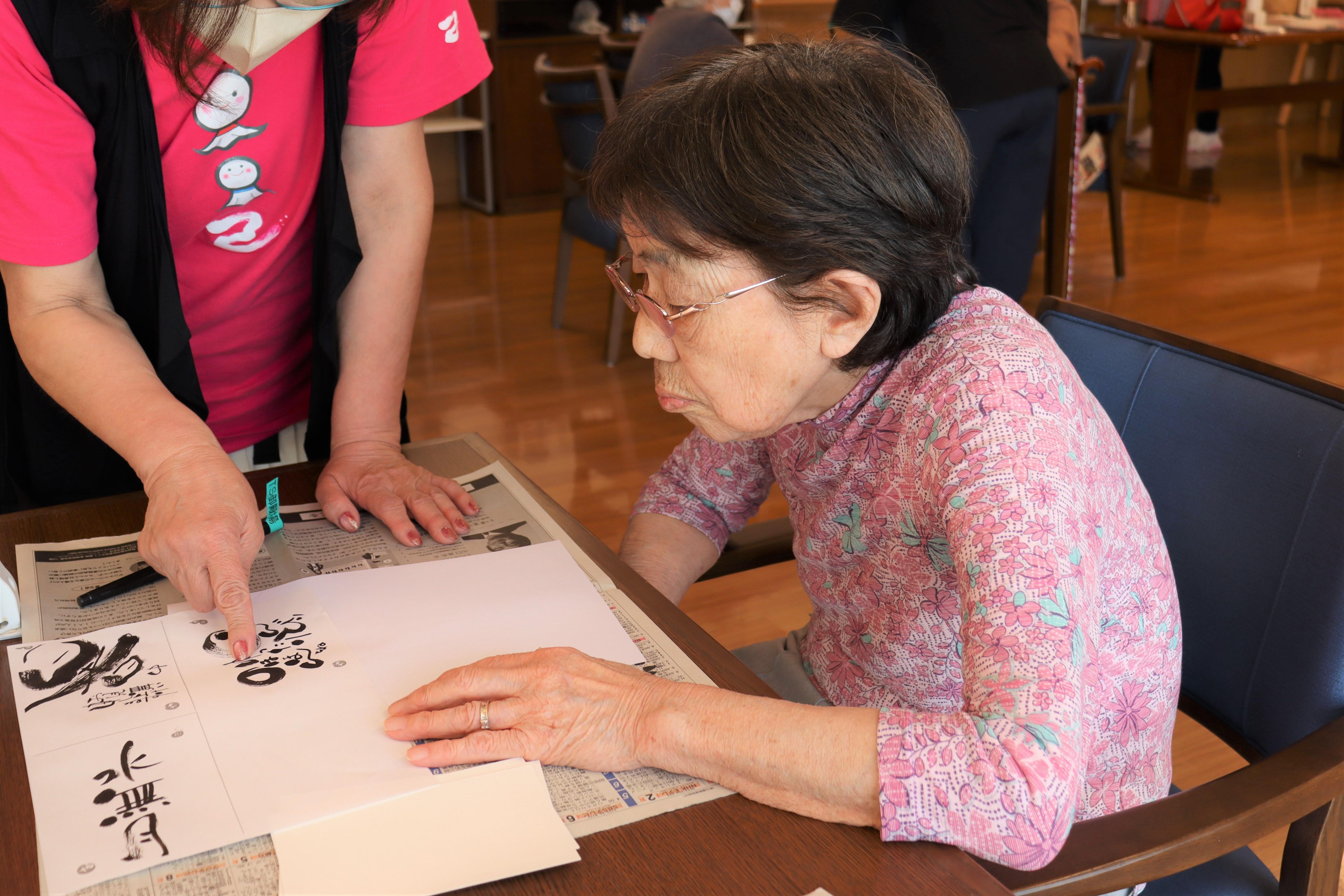 筆ペンに慣れていないと、なかなかうまく書けません。絵を描く様な思いで、思うがままに…。お習字に慣れていると、なかなかうまくいかない様です。習字が苦手なスタッフですと、これが見事な作品に!
