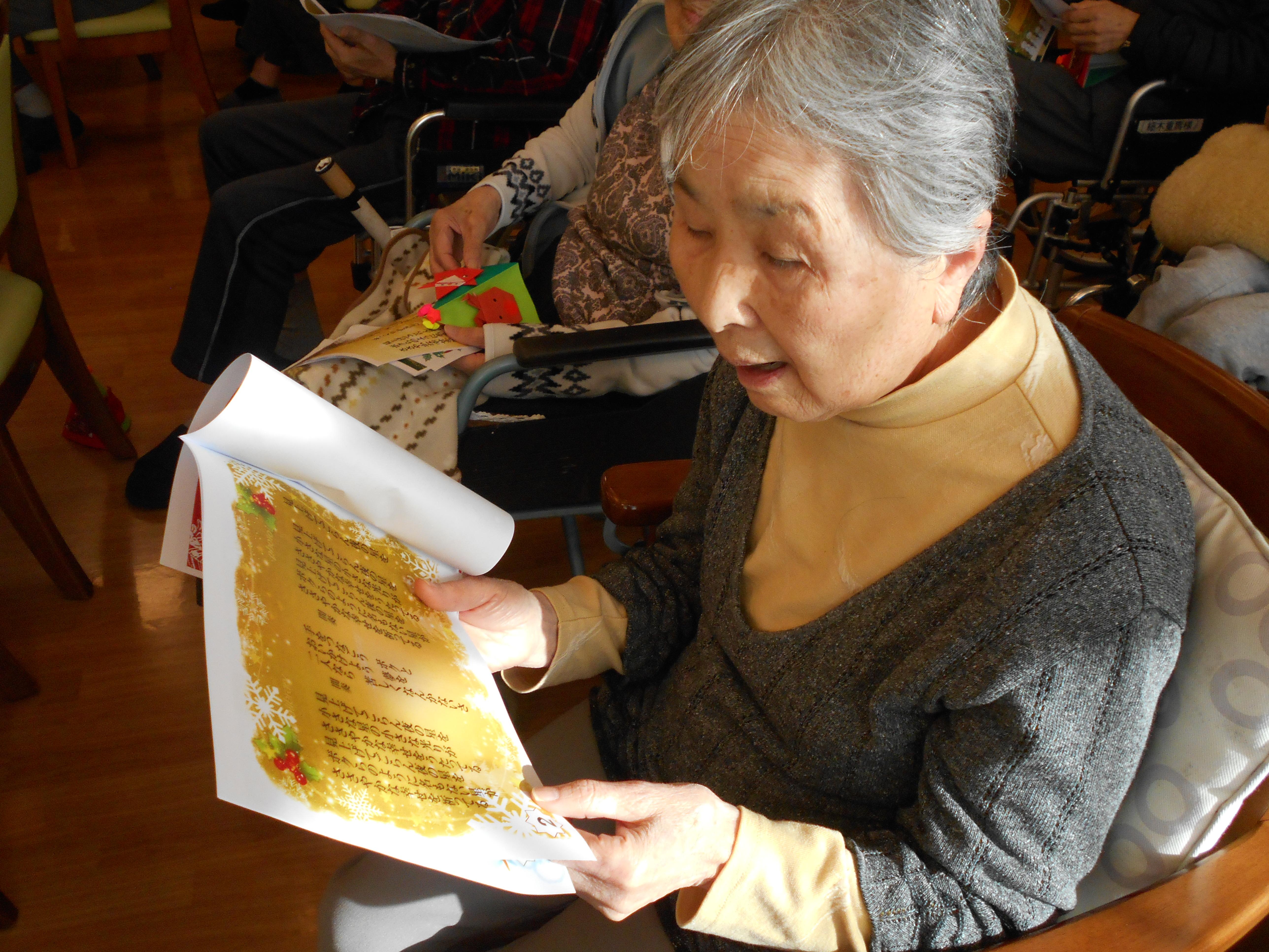本日はクリスマス会を行いました。この日のために、栄養課ではハンドベルの練習をしてきました。又、お客様もクリスマスソングの練習を行い、職員の伴奏と共に歌われました。
