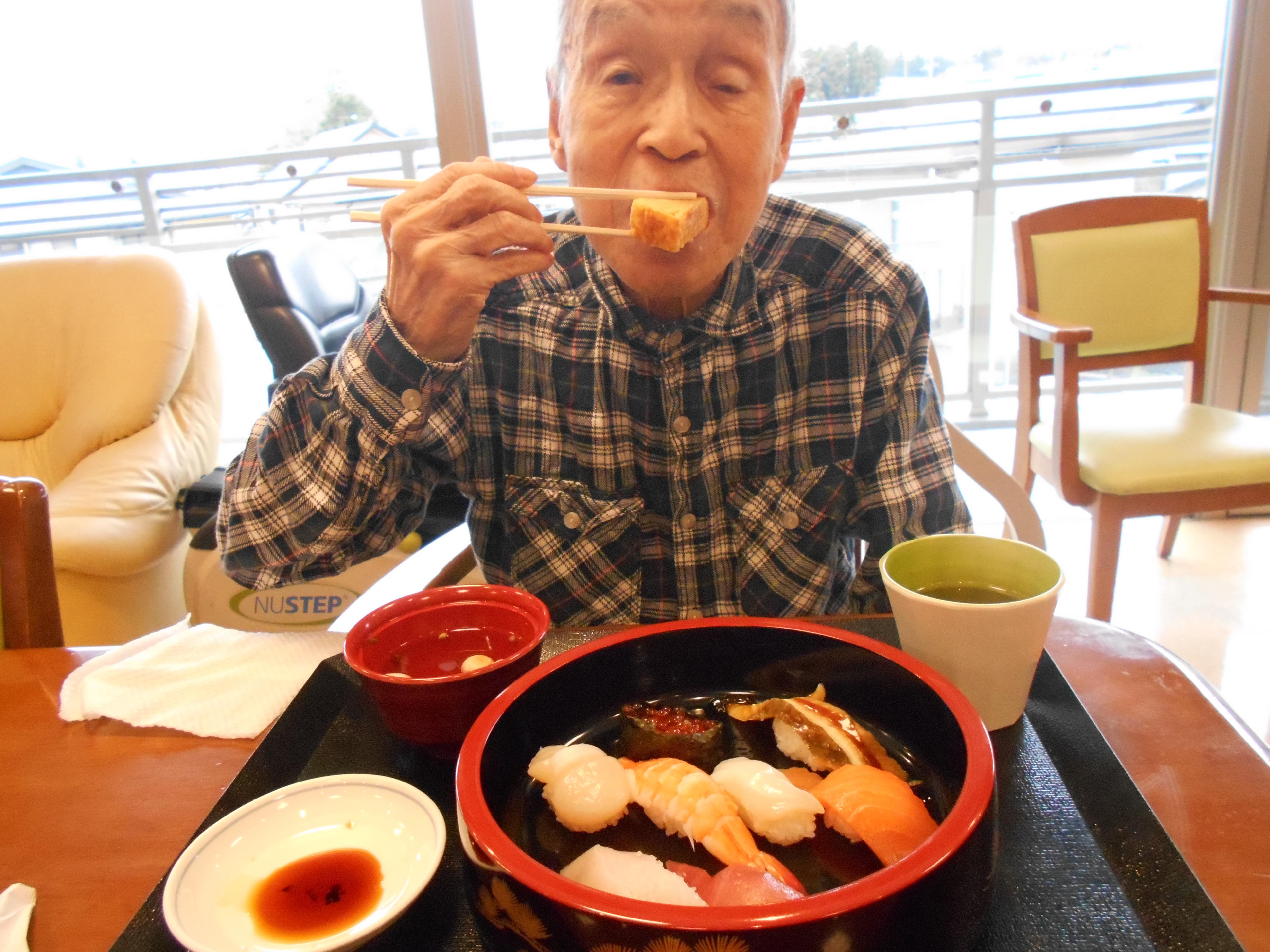 本日の昼食は、月に一度の出前寿司でした。お寿司が好きな方が多く、とても喜んでいただけました。