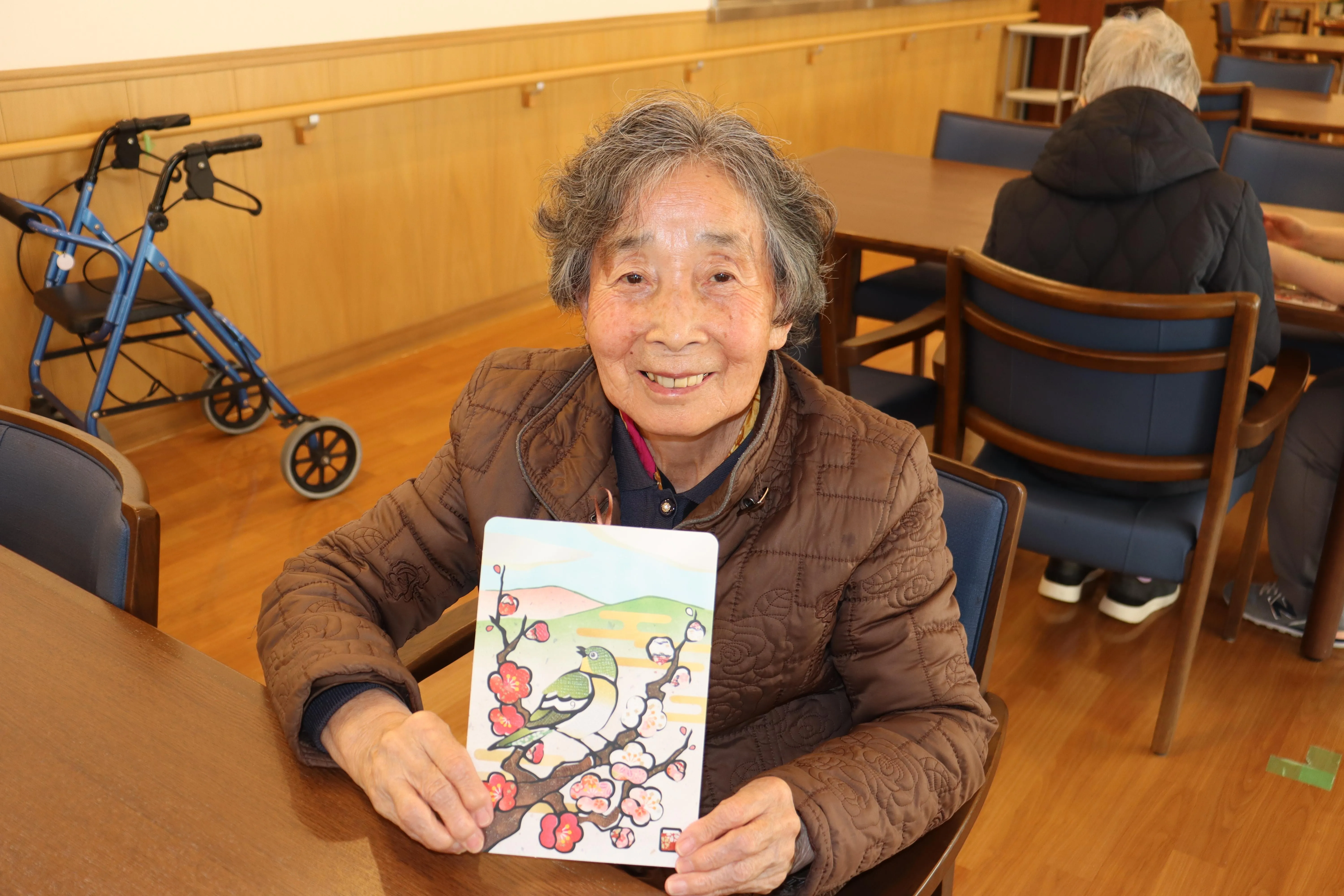 今回のもの作りは、シールはり絵「梅と鶯」です。型とシールに番号が振られており、順番に貼り進めていきます。大きなシールもあれば小さいシールもあり、ピンセットやスタッフの手を借り黙々と作品を仕上げていました。