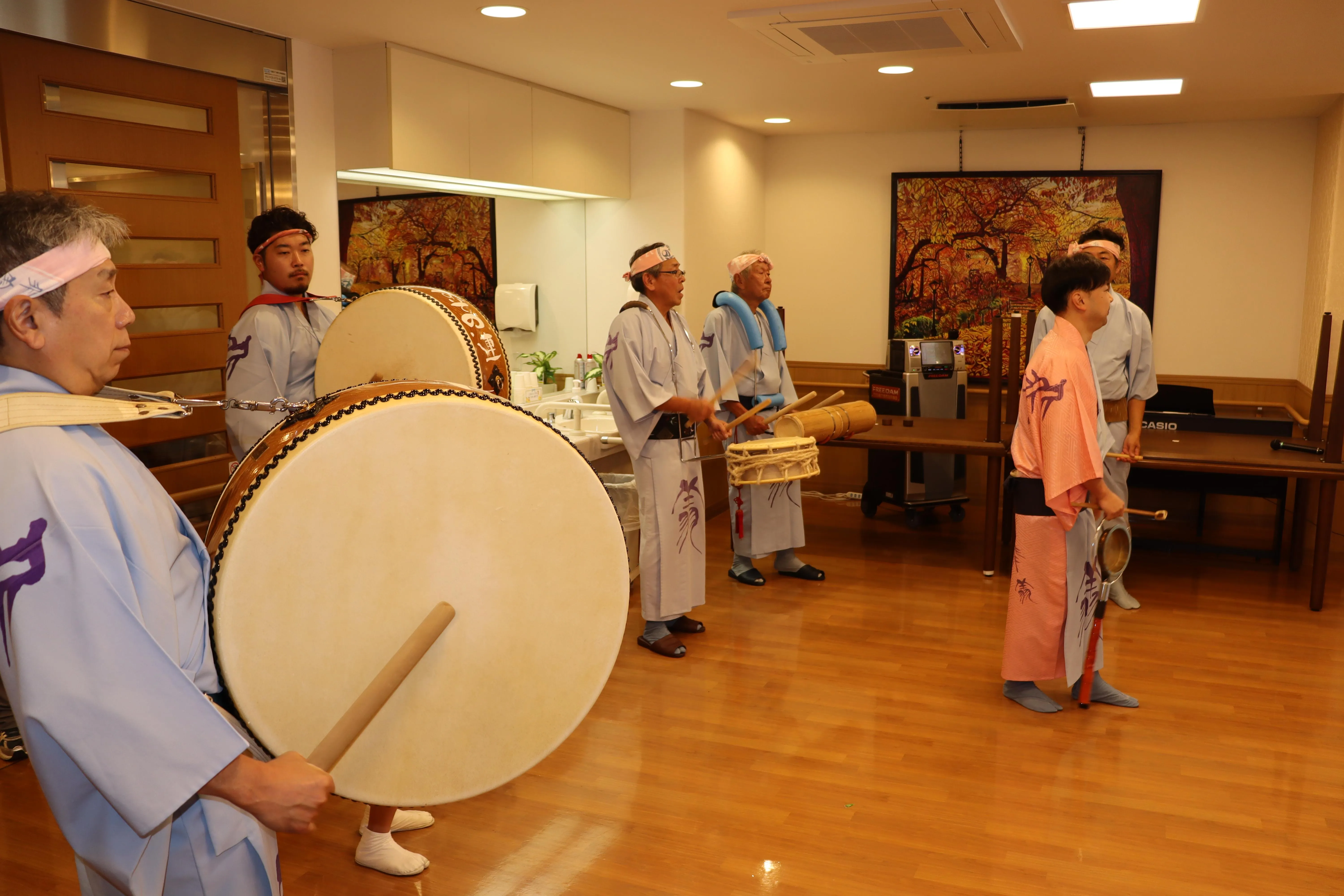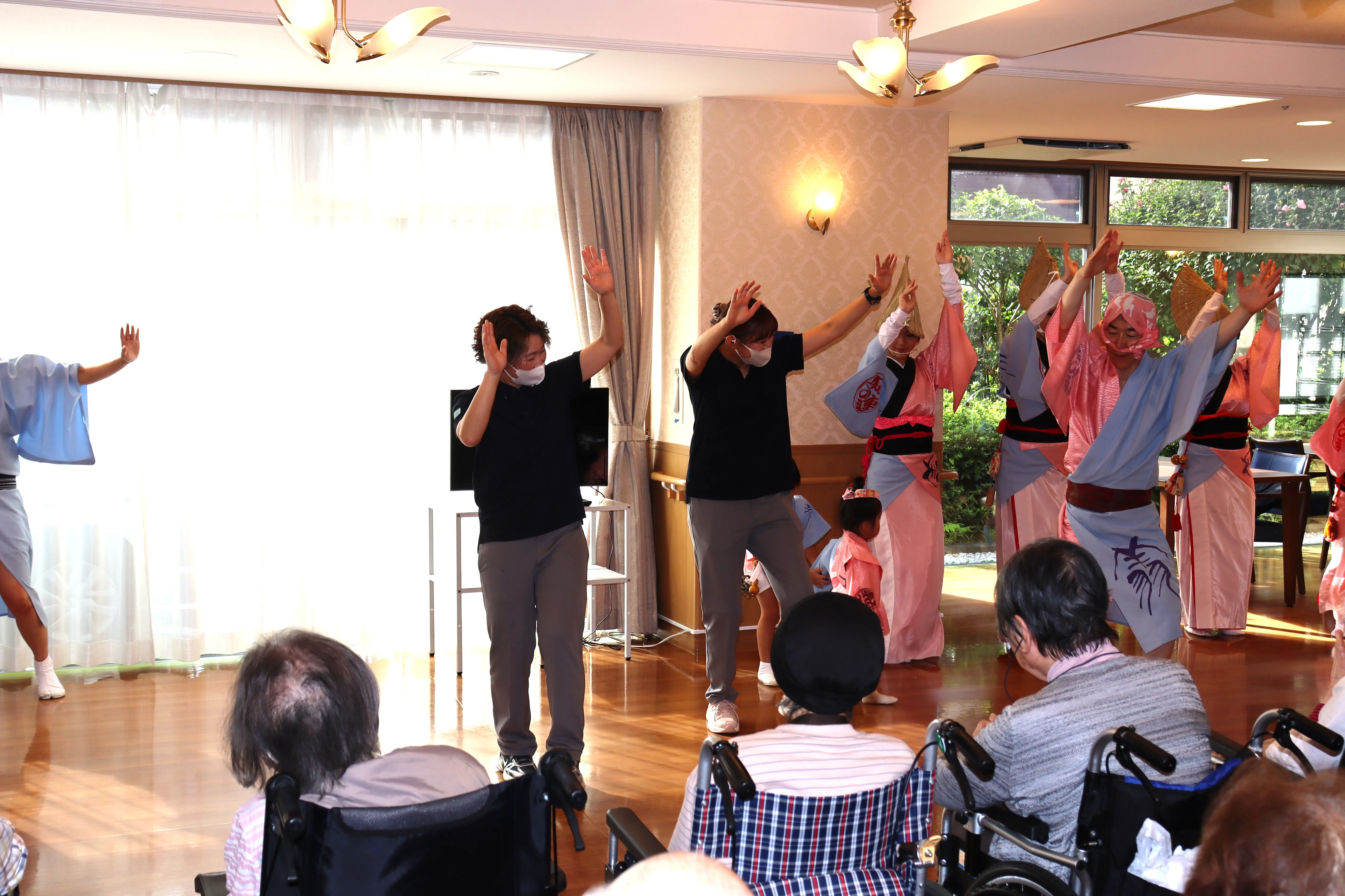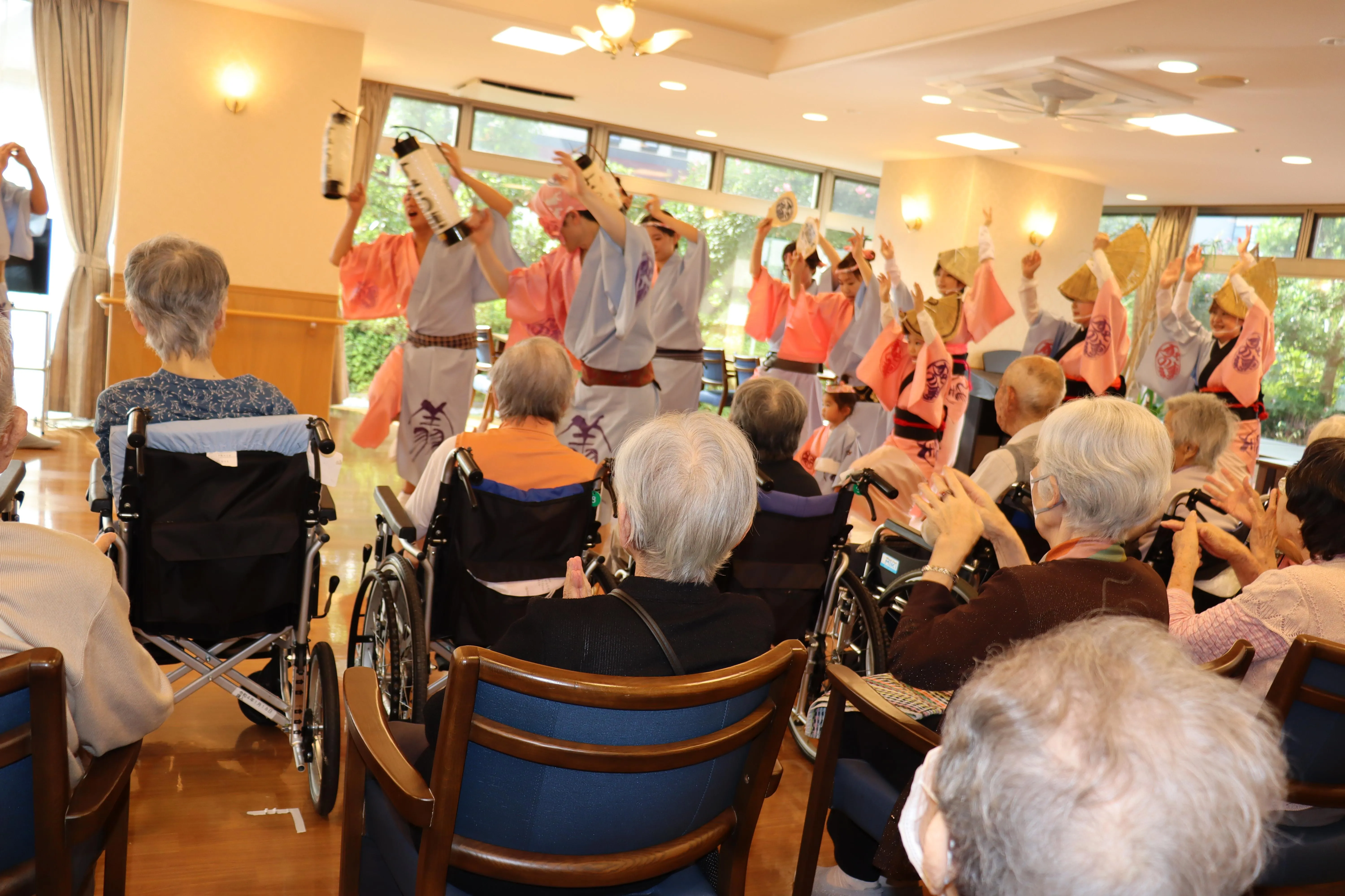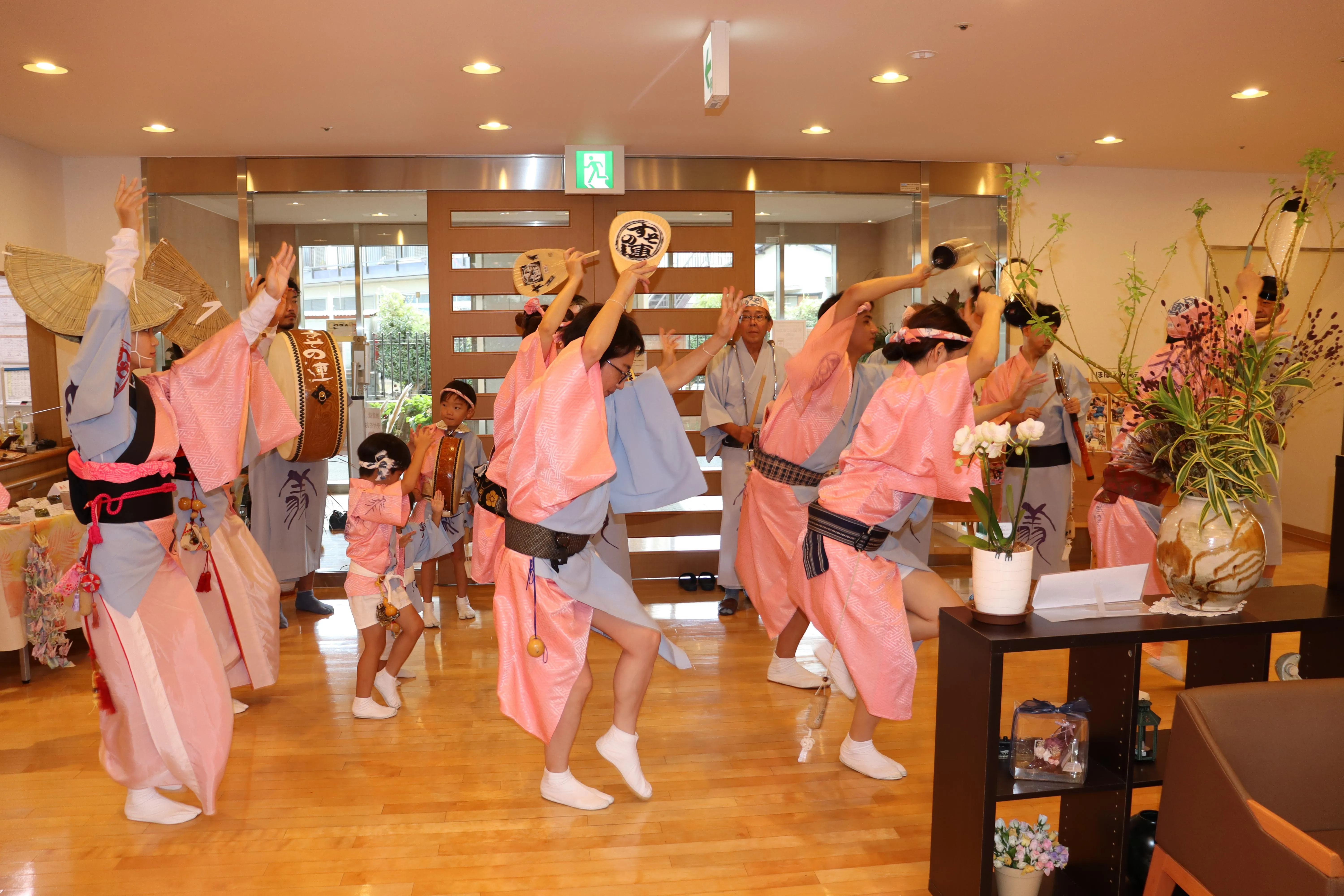 阿波踊り裾野連の方が来てくださいました。お囃子の音に、お昼寝モードのお客様も目がぱっちり!太鼓のリズムに、自然に体が動き出していました。