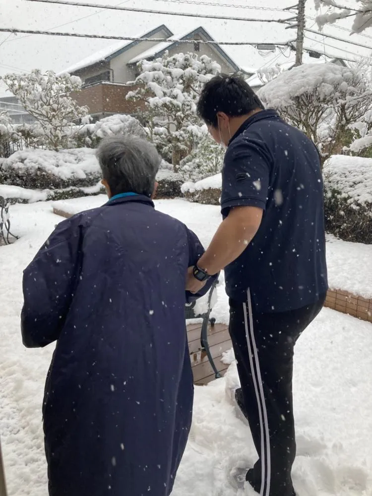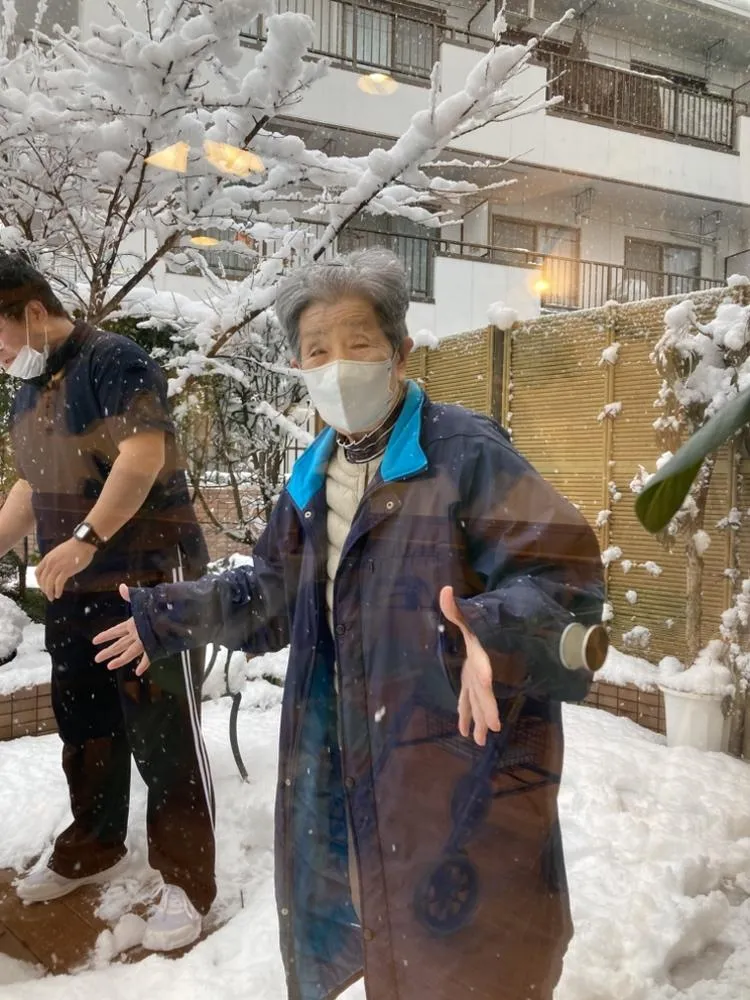 少しだけお庭に出て、積もったばかりの雪をギュッギュと踏みしめる感触を楽しみました。『昔はよく遊んだものよ』と懐かしいお話しにも花が咲き、雪だるまも作りました!
