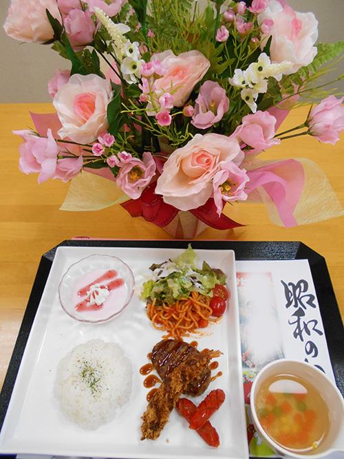 お膳上の昭和の日仕様の紙も喜んでいただき、居室へ持ち帰って飾られる方もいました。