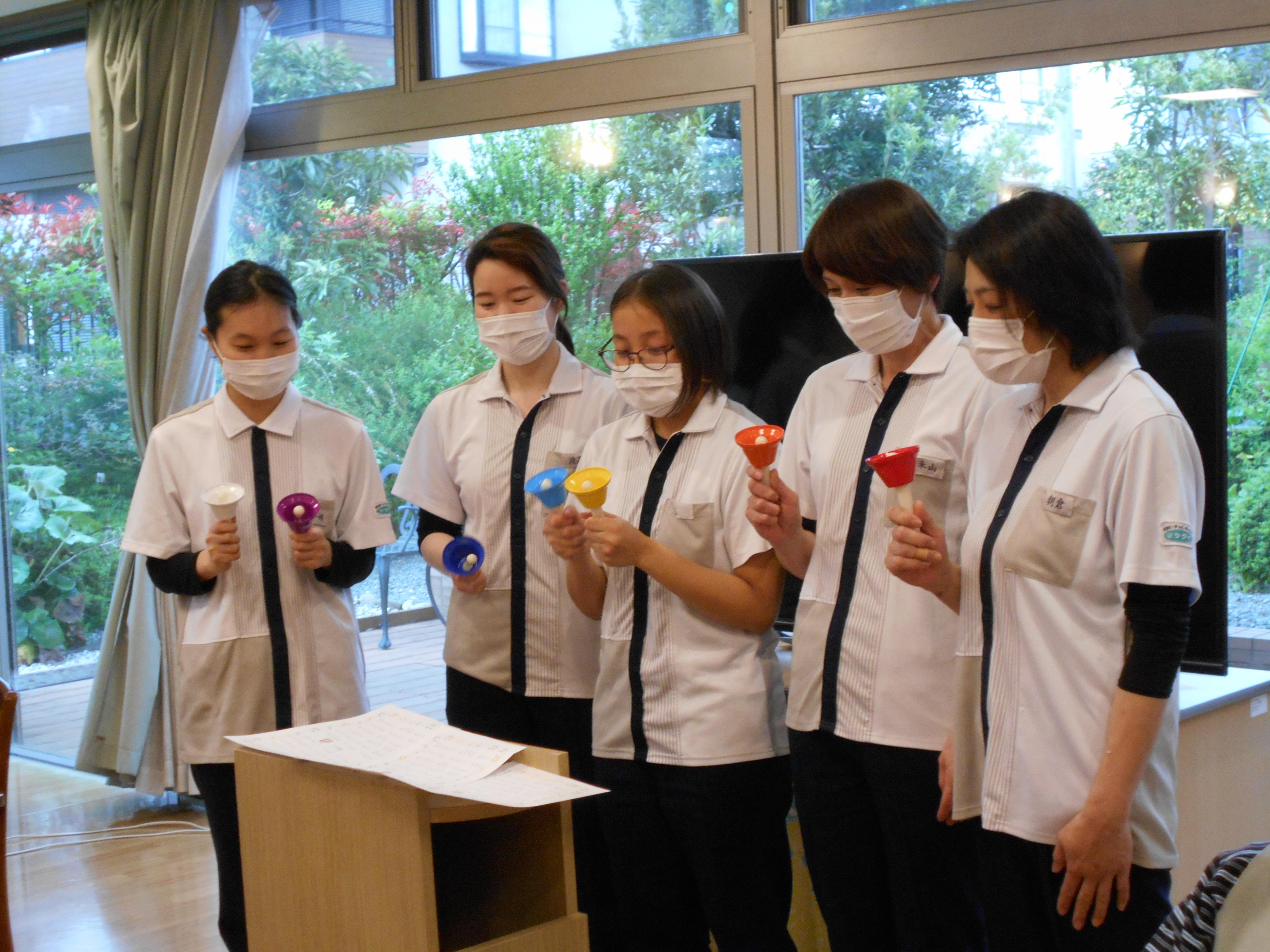 昼食前に食堂にて、栄養課によるハンドベルを演奏させていただきました。