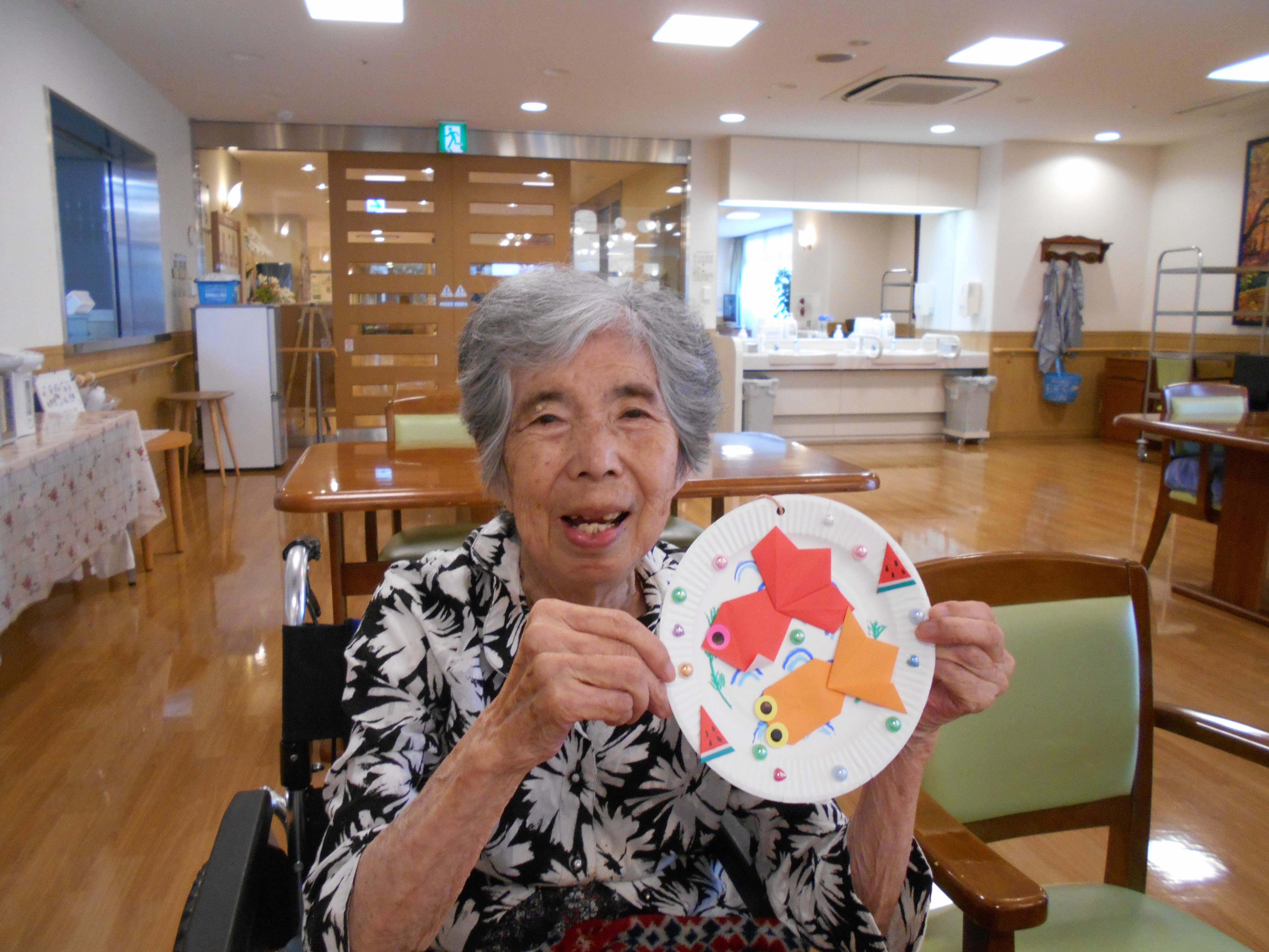 本日の折り紙教室では、夏らしい金魚を折りました。デコレーションした紙皿に、皆さんで折って頂いた金魚を貼りつけて完成!