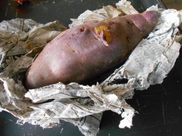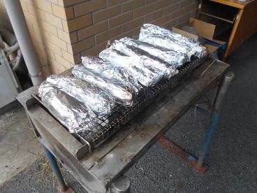 前日にお客様に協力していただき、サツマイモに濡れ新聞とアルミホイルを巻いていただきました。