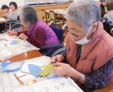 本日は、ちぎり絵を作成しています。ちぎり絵のキットを使用してではありますが、皆様真剣に作品作りを行っていました。