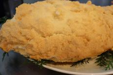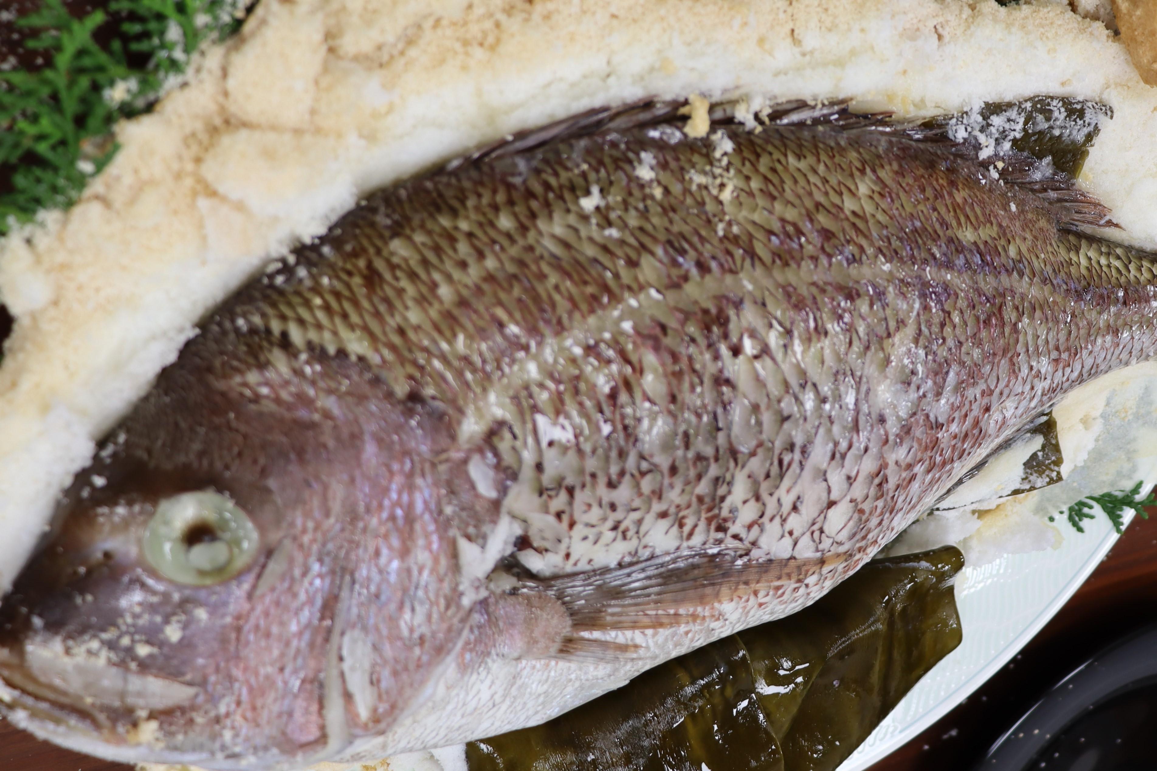 ご本人様には少し硬い状態でしたので、娘様に塩釜を割って頂きました。尾頭付きの鯛が現れ、奥様やご家族も驚かれておりました。
