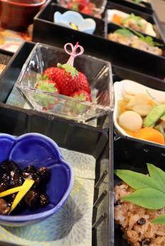 ご家族を招き、ご夫婦家族団らんで過ごして頂きました。塩釜焼、赤飯、筑前煮等々のお祝い膳で栄養課職員がお祝いしています。