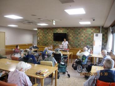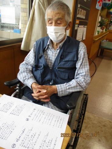 今日は15:30から5Fのお客様22名様が参加され、「夏の思い出」「若い力」「丘をこえて」「仲よし小道」「瀬戸の花嫁」「炭坑節」「見上げてごらんよりの星を」の7曲を歌って頂きました。
