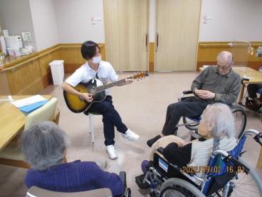 【ふるさと】や【おぼろ月夜】【茶摘み】など、スタンダートで有名な曲をメインとし、ギターの生演奏に乗せて、お客様に歌って頂いております。
