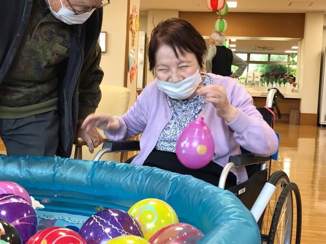 水ヨーヨー釣りでの一コマ。皆様真剣に取り組まれ、スッと釣り上げるお客様もいれば、中々釣れずに苦戦されているお客様もいらっしゃいました。上手く釣り上げた後は、皆様とても嬉しそうにされていました。