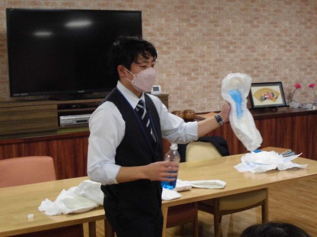 介護職員が実際に製品を手に取り、お客様にどのように使用したら良いのか?今までのものよりどこが優れているのかを勉強致しました。実際に手に取ってみての感想は、従来のものよりも軽く、柔軟性、吸収力、吸収のスピード、吸収後の質感に優れていると感じました。