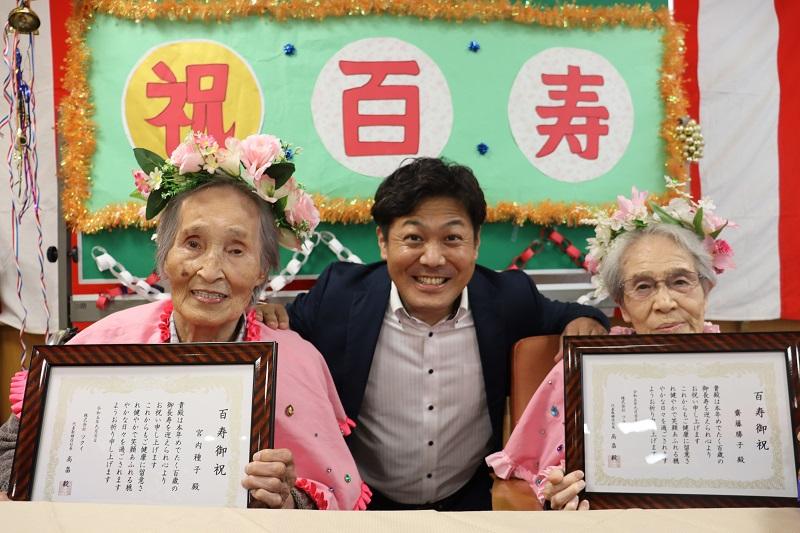9月でお二人100歳をお迎えになりました。百寿ということで桃色のケープと花冠で記念撮影「ハイポーズ」