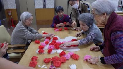 赤や桃色、白などのお花紙を一枚一枚めくってお花を開いていきます。