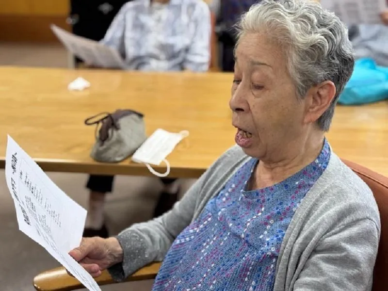 ギターとピアノの温かな生演奏に合わせて、秋の唱歌や懐かしい流行歌などを皆さまと一緒に歌いました。普段はなかなか声を出す機会が少ないお客様も、音楽に包まれると自然と口ずさみ、会場全体が柔らかい歌声でひとつになっていきました。
