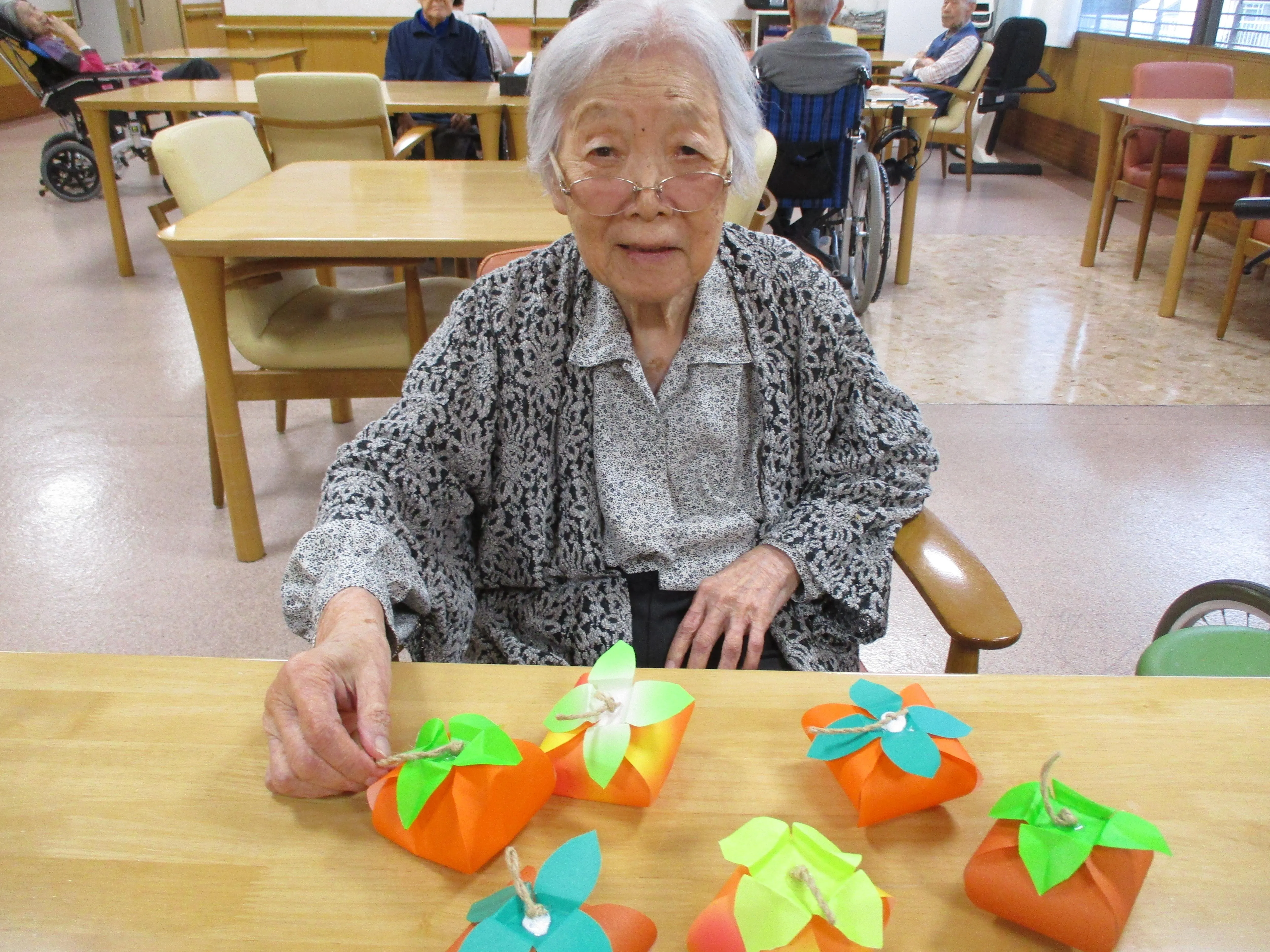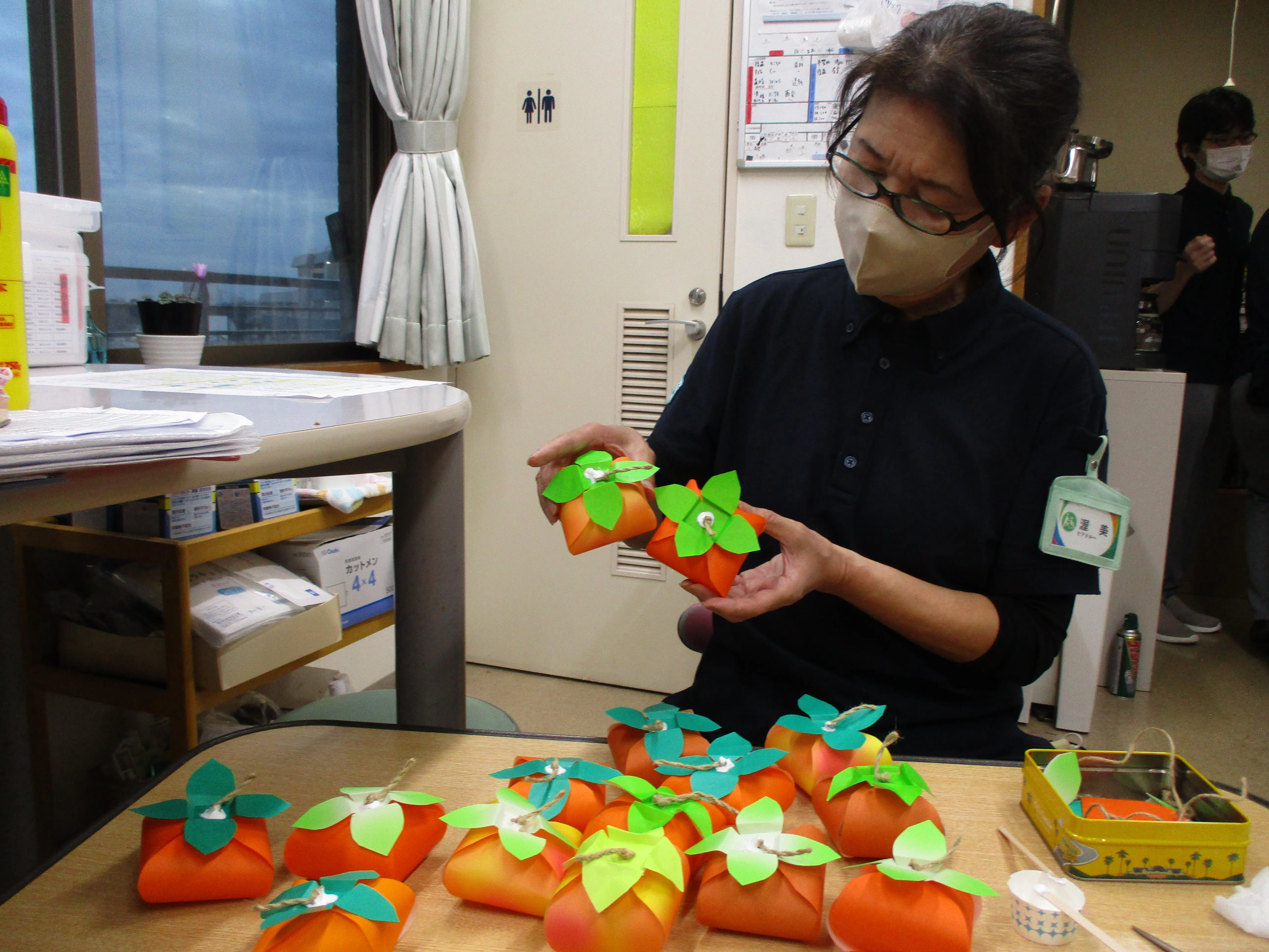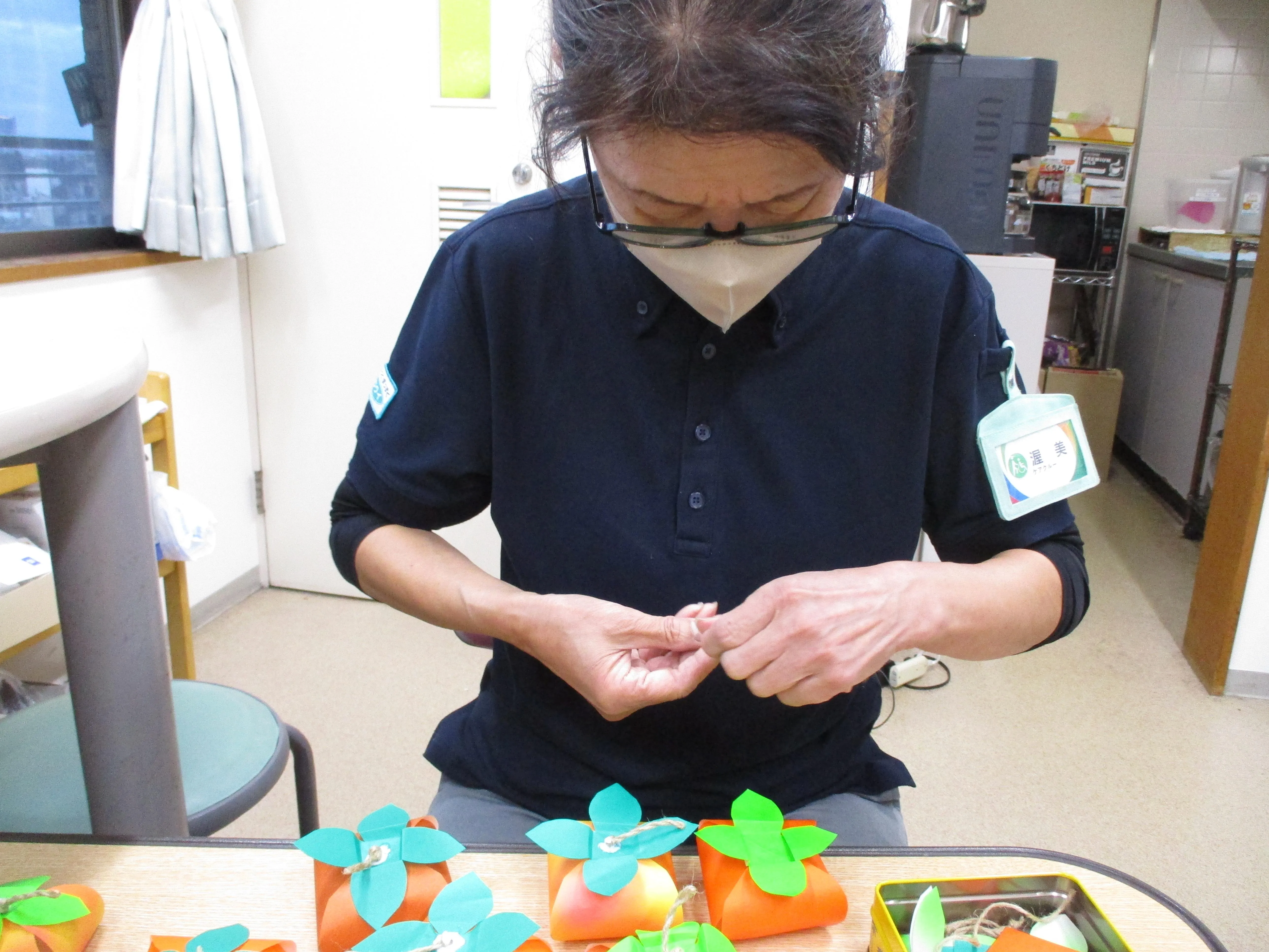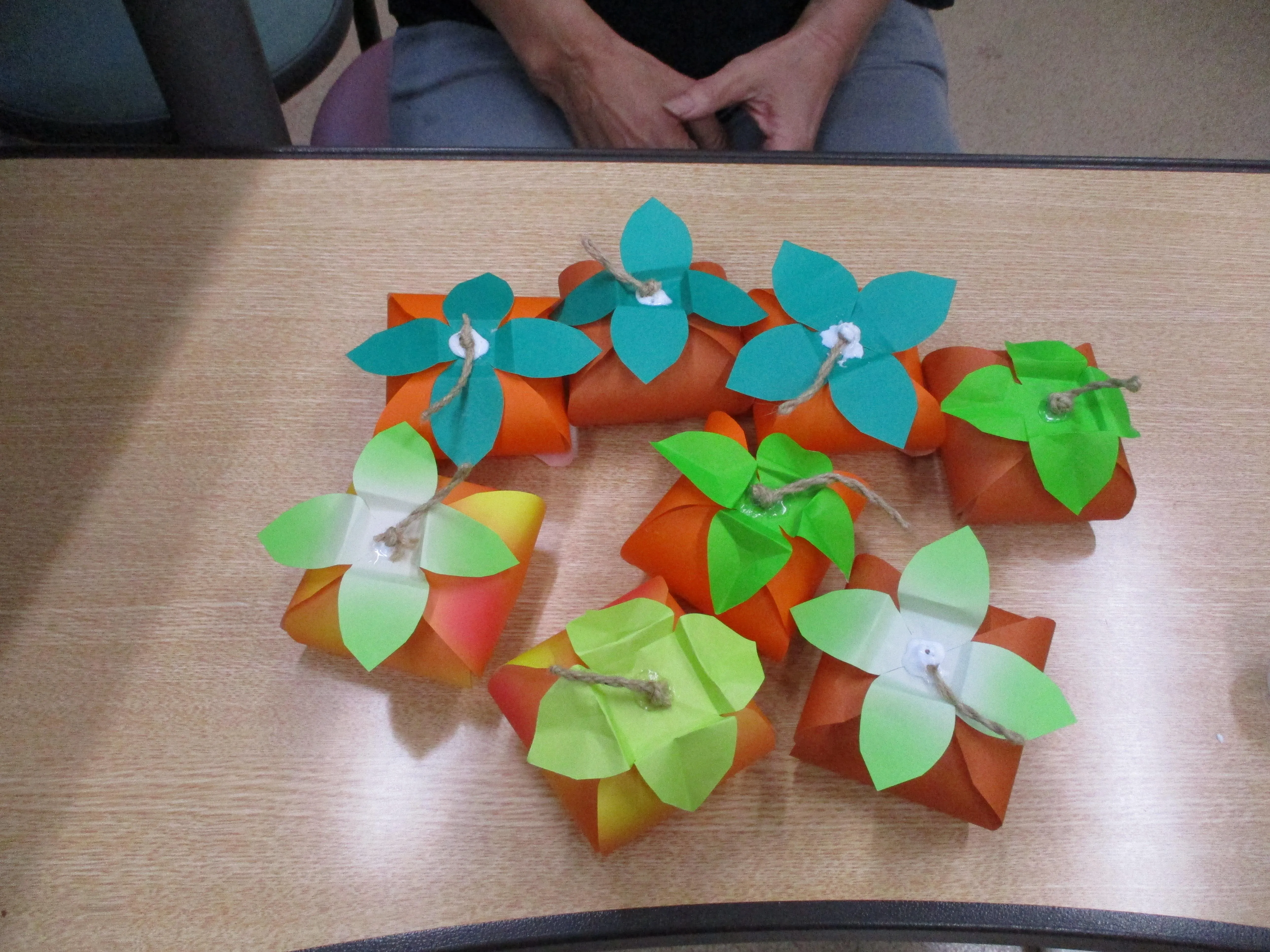 柿の型をくり抜いた折り紙の四隅を、糊で貼り合わせます。