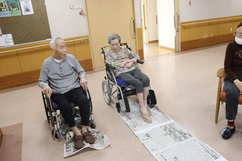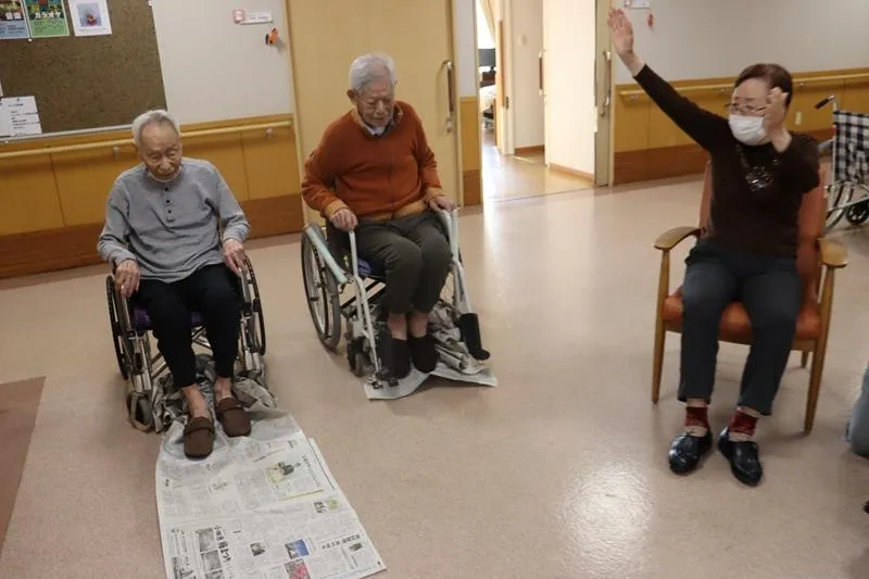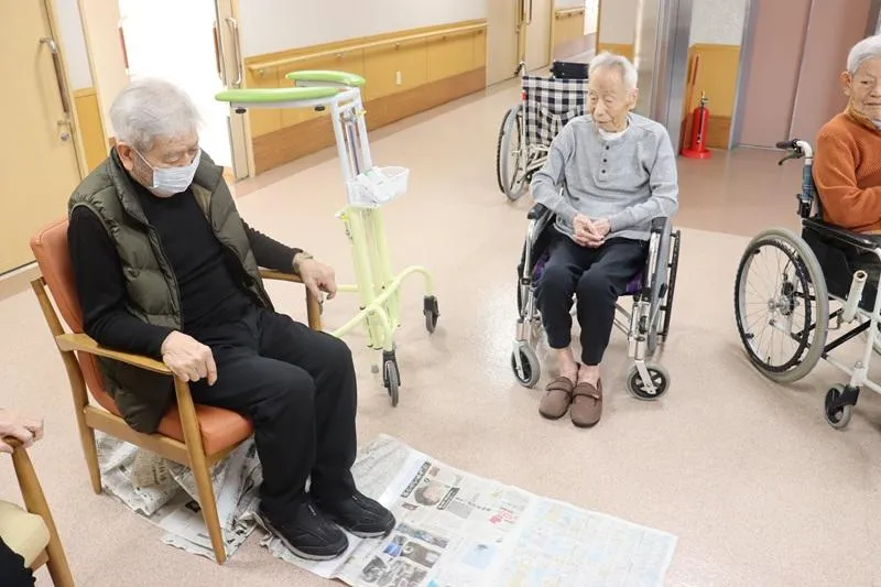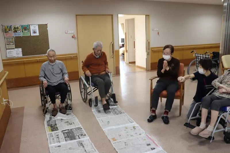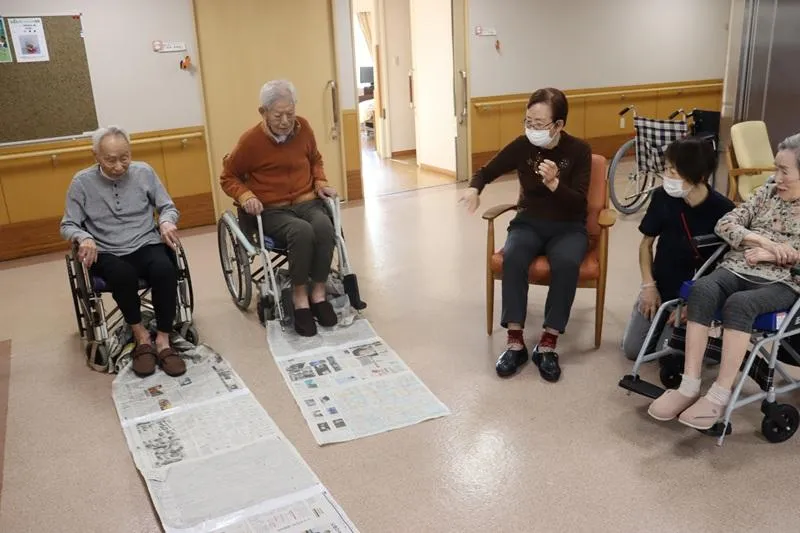 座った姿勢から、長くつないだ新聞紙を、足だけ使って自分の足元に引き寄せるゲームです。