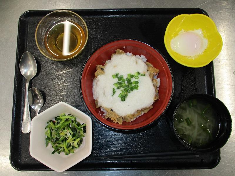 夏バテ防止に栄養をとってほしい、という願いを込めて、お肉ととろろたっぷりの丼ものをご用意しました。副菜やデザートはさっぱりに仕上げて、バランスよくしています。