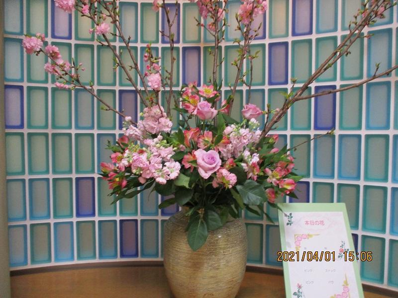 薔薇を真ん中に据えて、ピンクのアルストロメリアとストック、八重桜をまわりに活けました。