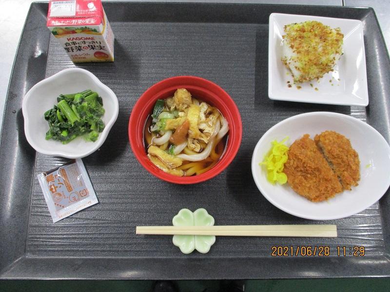おにぎり 小盛きつねうどん ミニメンチカツ 菜の花の胡麻和え 野菜ジュースで、ご提供致しました。