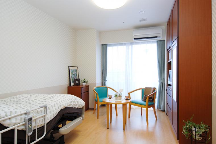 約12畳の居室には電動リクライニング式ベッド・椅子・テーブル・エアコン・収納家具などを標準装備。