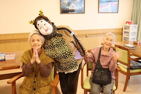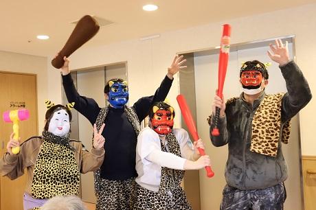 各フロアにおやつの時間に合わせて、鬼に扮した職員が登場し、豆ならぬ豆に見立てたボールを投げていただきました。