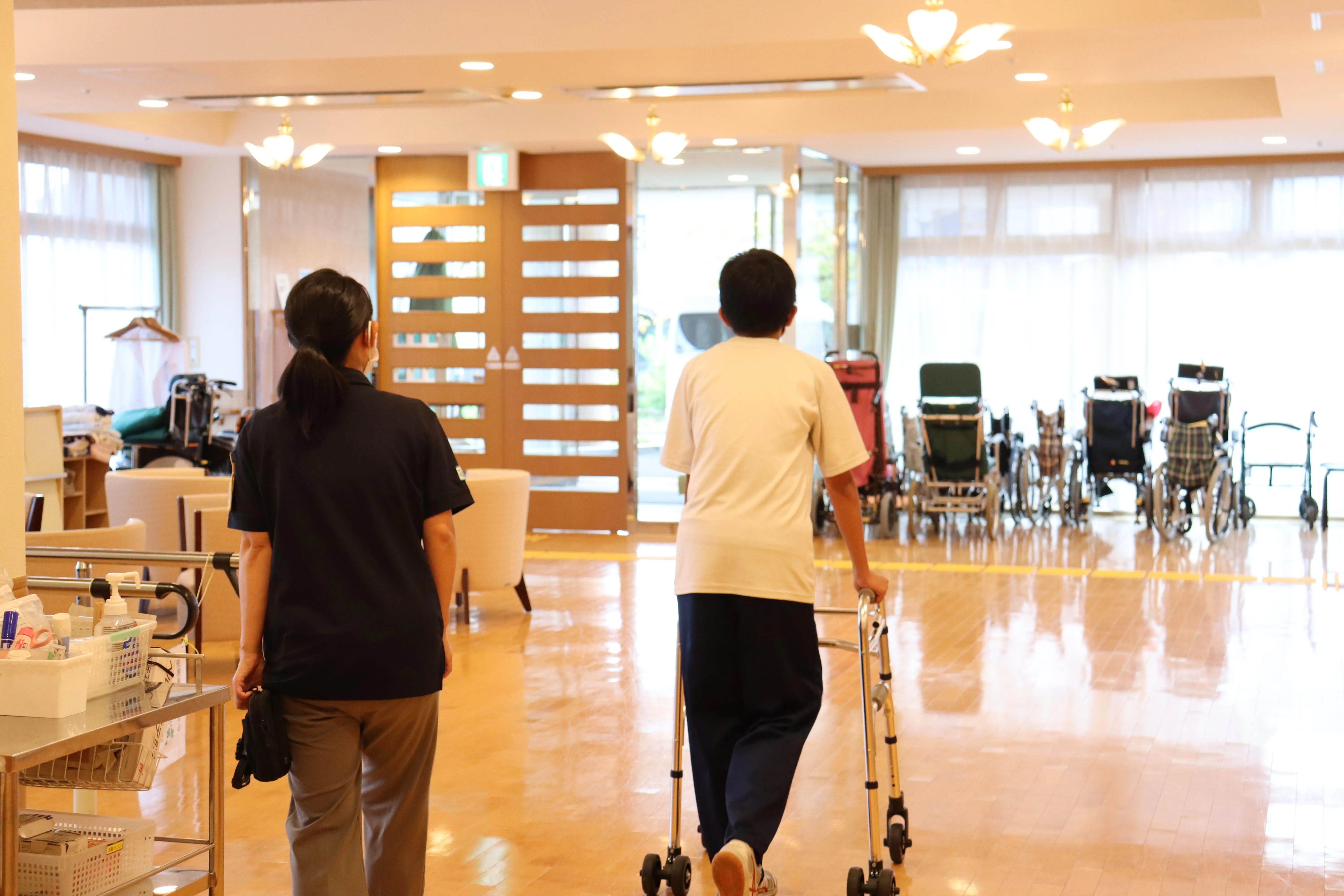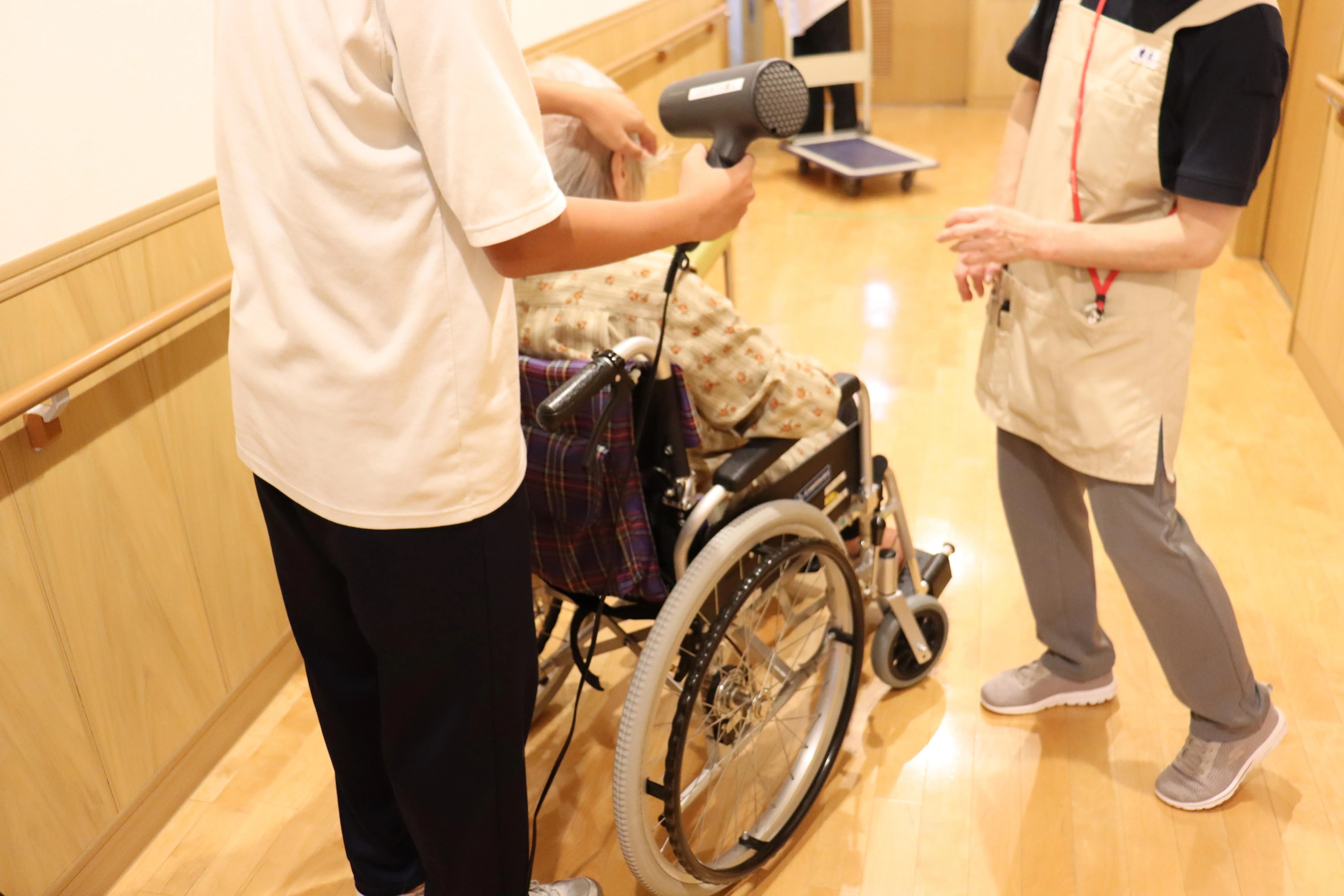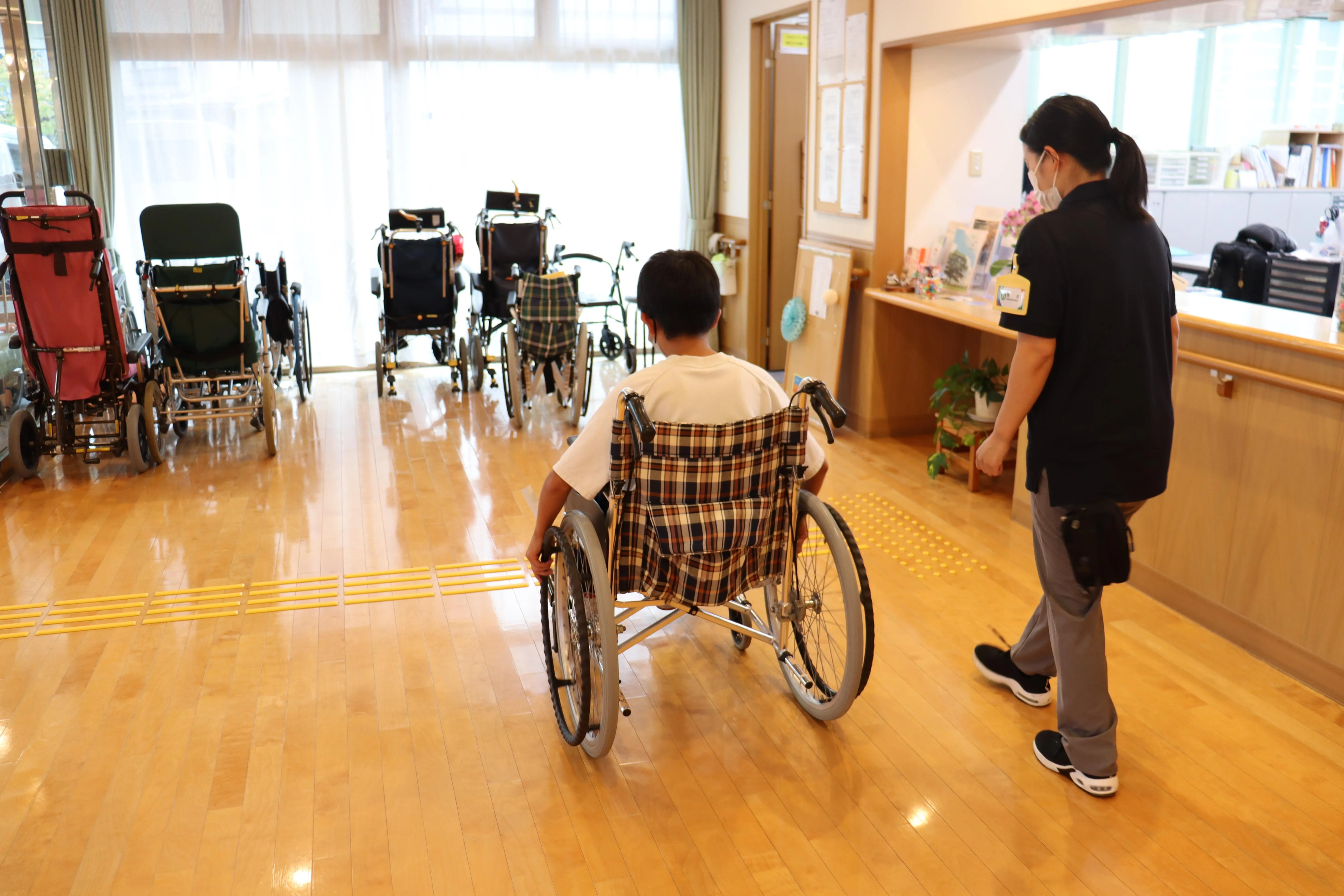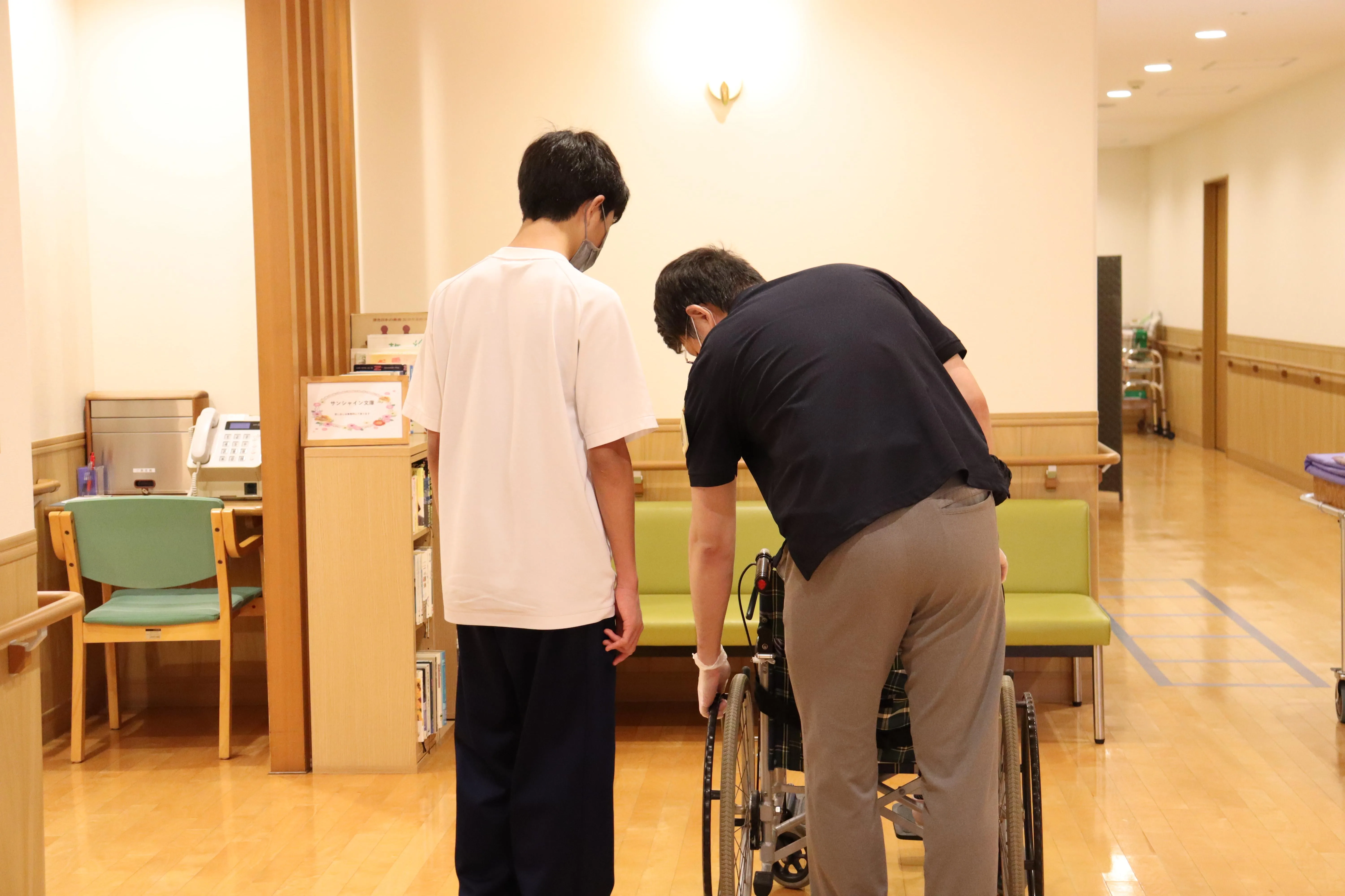 10/7~9まで、市内の中学生が職場体験に来ました。お客様とお話しや体操をしたり、車いすの乗車体験、介助の見学などをしていただきました。お客様も若い中学生からたくさんのパワーをいただき、ニコニコ笑顔がたくさん見られました。