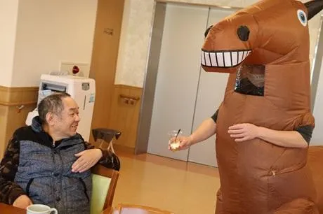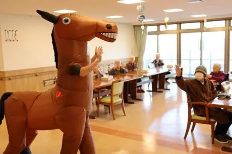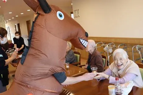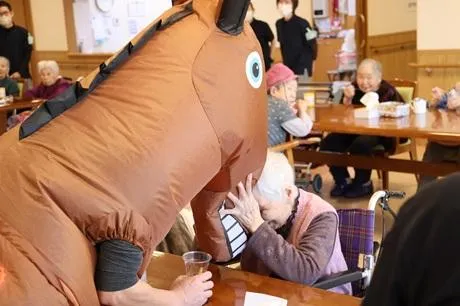 手作りおやつで、生のリンゴを調理したリンゴパフェを提供いたしました。なんと皆様にお配りしたのが、お正月に登場した午(うま)でした。驚きと笑顔があふれたのちに、おやつを楽しまれていました。