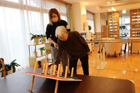 また、【輪投げ】を使った運動は前傾姿勢を保つ運動ができ、上肢の可動域及びバランス力強化となり、転倒予防に効果が期待されます。