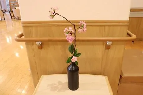 近隣の方より、ご自宅の河津桜の木を選定した際にでた枝を頂き、施設内に飾りました。