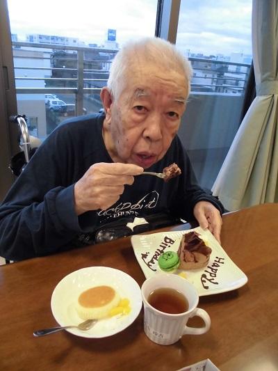 今日は3階のお客様が、お誕生日を迎えられました。「誕生日プレゼントはケーキが食べたい!」ということでしたので、おいしそうなチョコレートケーキをプレゼントさせていただきました。いつまでもお元気で、今年もすてきな1年になりますように!
