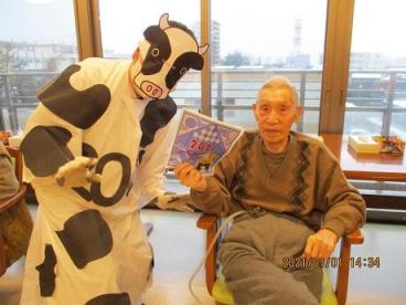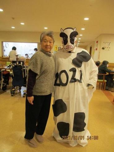 昨年の「ネズミ」と「獅子舞」に続き・・・今年の干支「丑」に扮して、あいさつをさせていただきました。