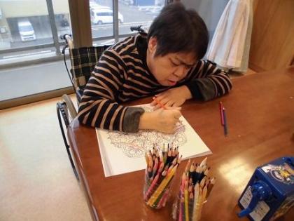 「こちらを向いてください。」とお声掛けさせていただきましたが、夢中でおとなのぬりえを楽しんでおられました。