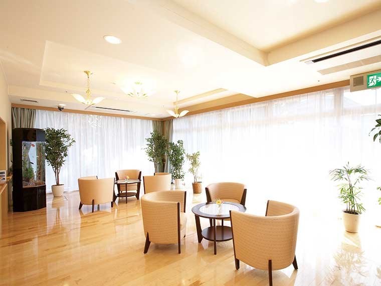 開放感あふれるエントランス。毎日のおしゃべりや面会時の団らんに、自由におくつろぎいただけます。
