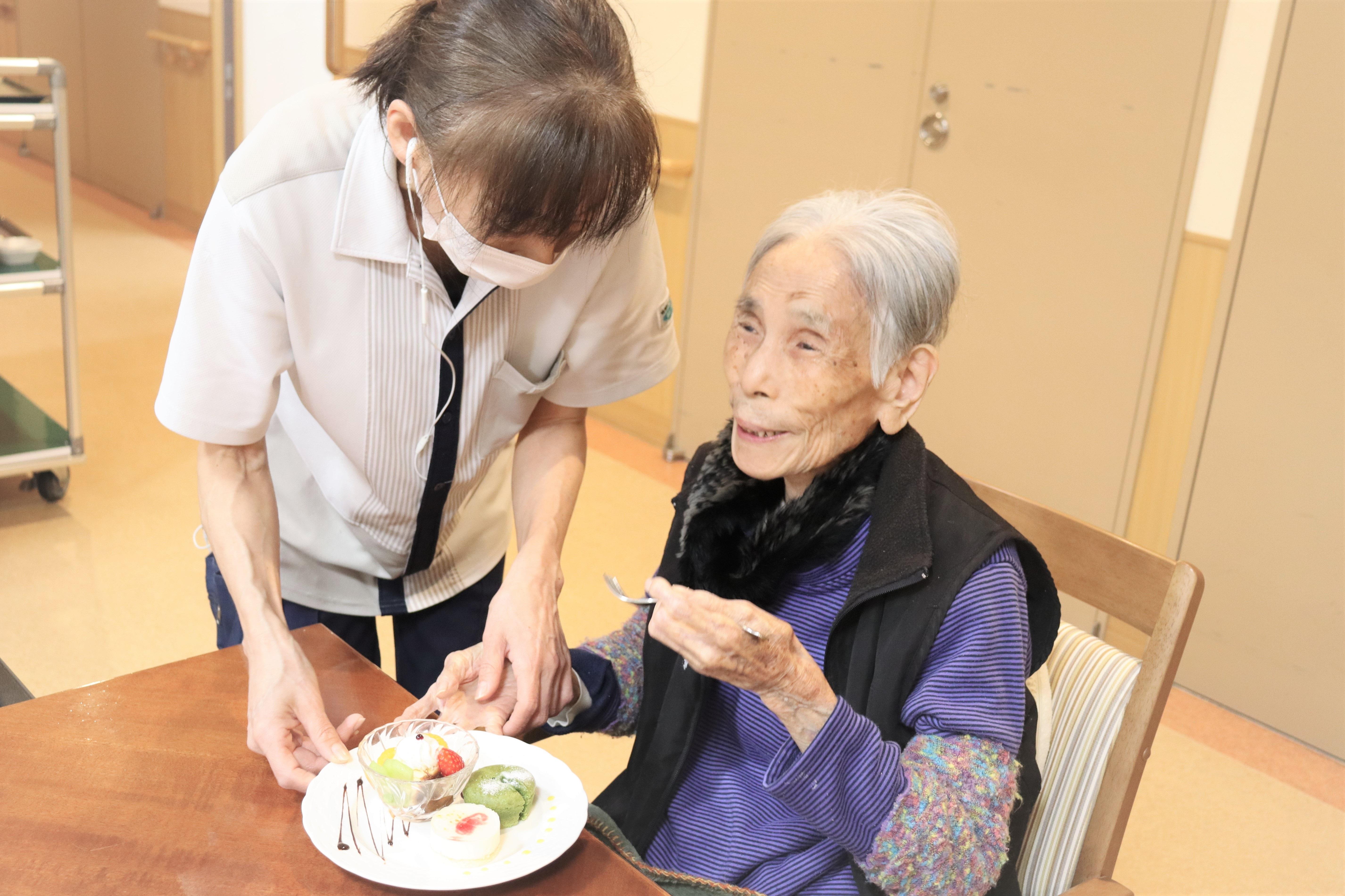2月生まれのお誕生日会を開催しました。介護職員手作りのバースデーカードをお贈りしました。三時のおやつには、華やかに盛り付けたケーキを召し上がって頂きました。