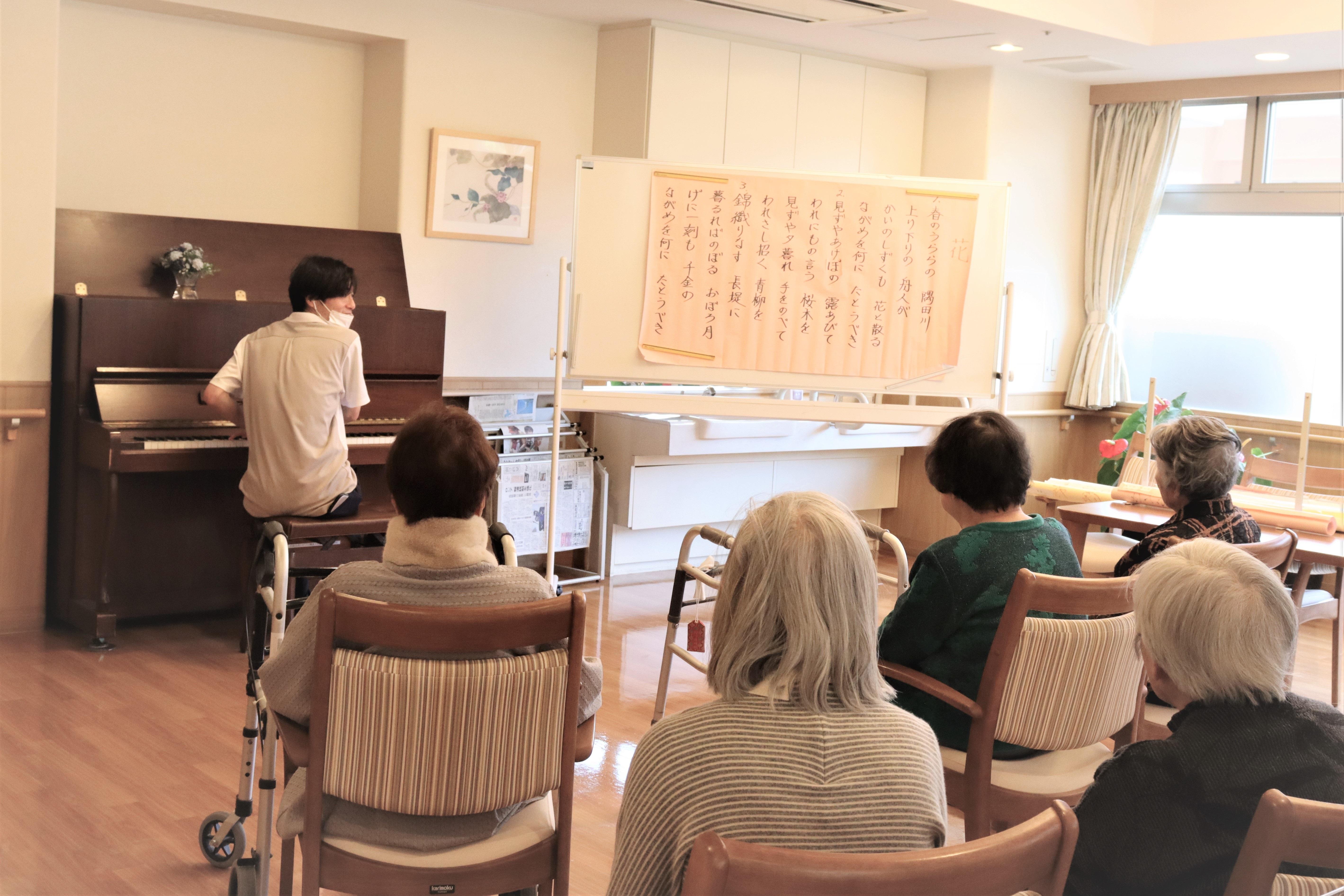 ピアノが得意な介護スタッフ、春の歌を演奏しました。美しいピアノの音色にうっとり。途中から歌詞カードを貼って、ピアノに合わせて合唱しました。「楽しい!」と仰って喜んでくださいました!