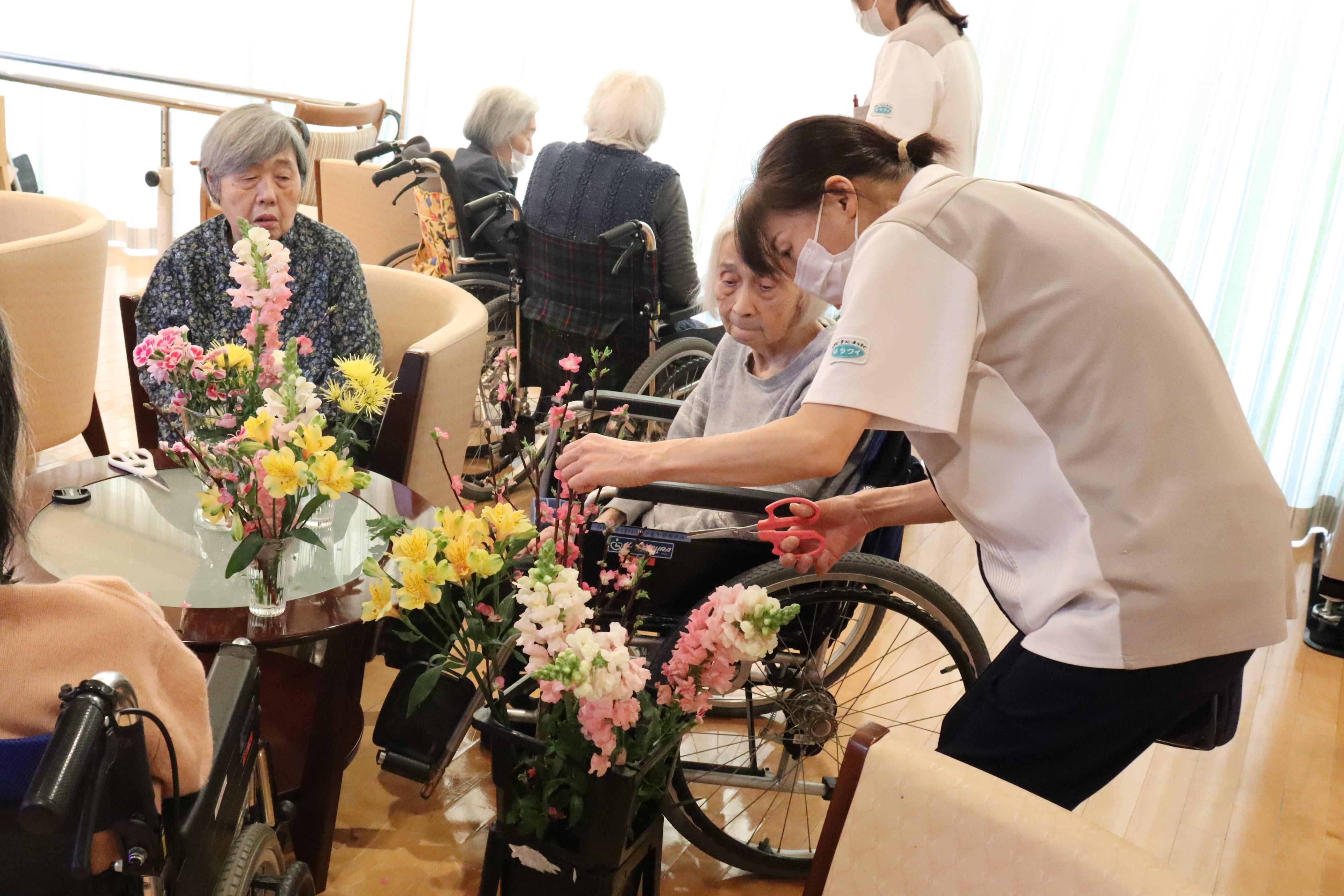エントランスの生花を活けかえました。まだまだ元気なお花、お部屋に飾るように皆様に活けて頂きました。ピンクや淡い黄色、春を感じる色とりどりのブーケができあがりました。お喋りと笑い声で賑やかなロビー、楽しい時間を過ごしました。
