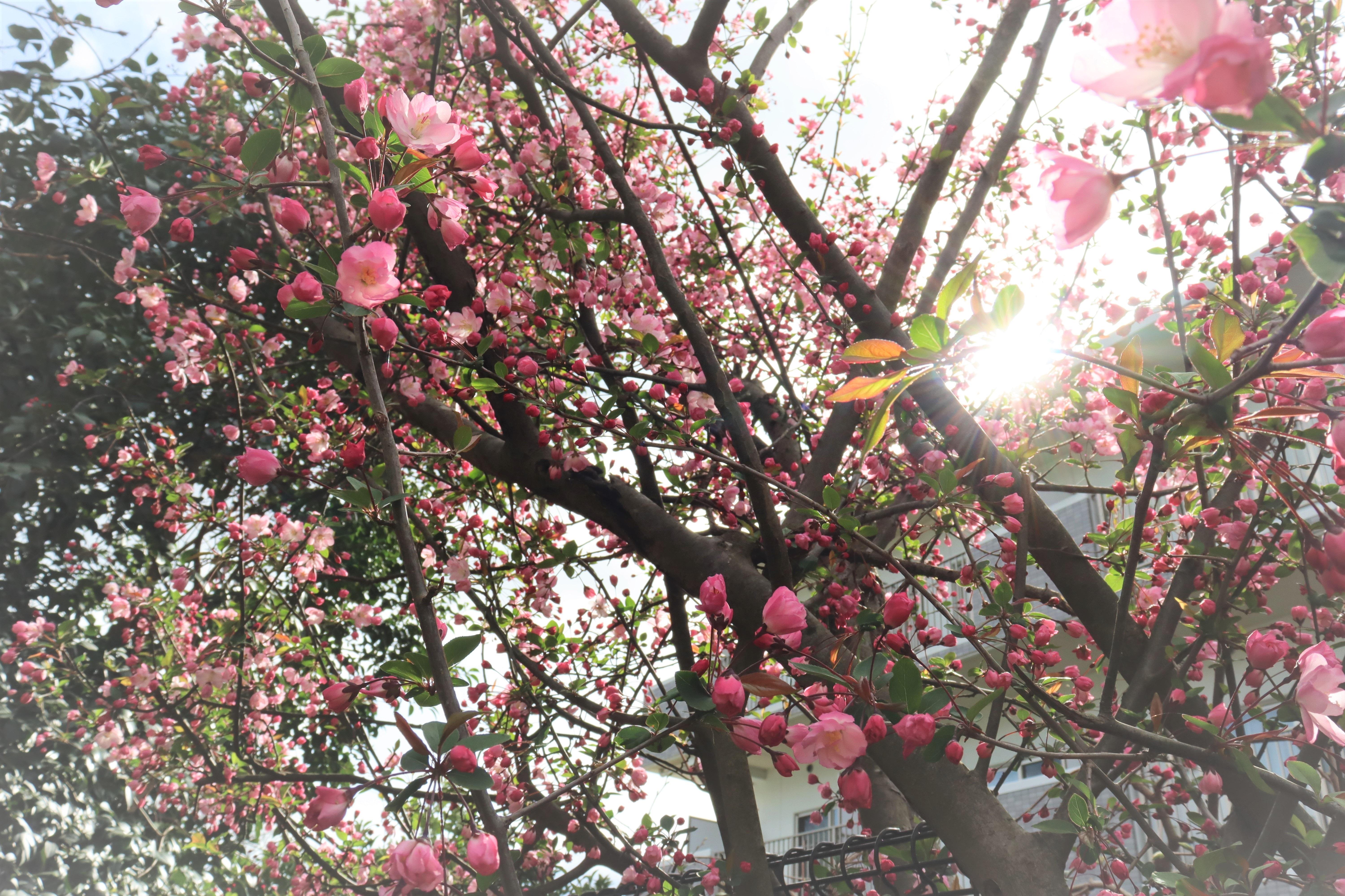 ソメイヨシノが散り始めました。まるでバトンを渡すように、枝垂れ桜の蕾が花開きました。そして、花海棠は満開を迎えました。