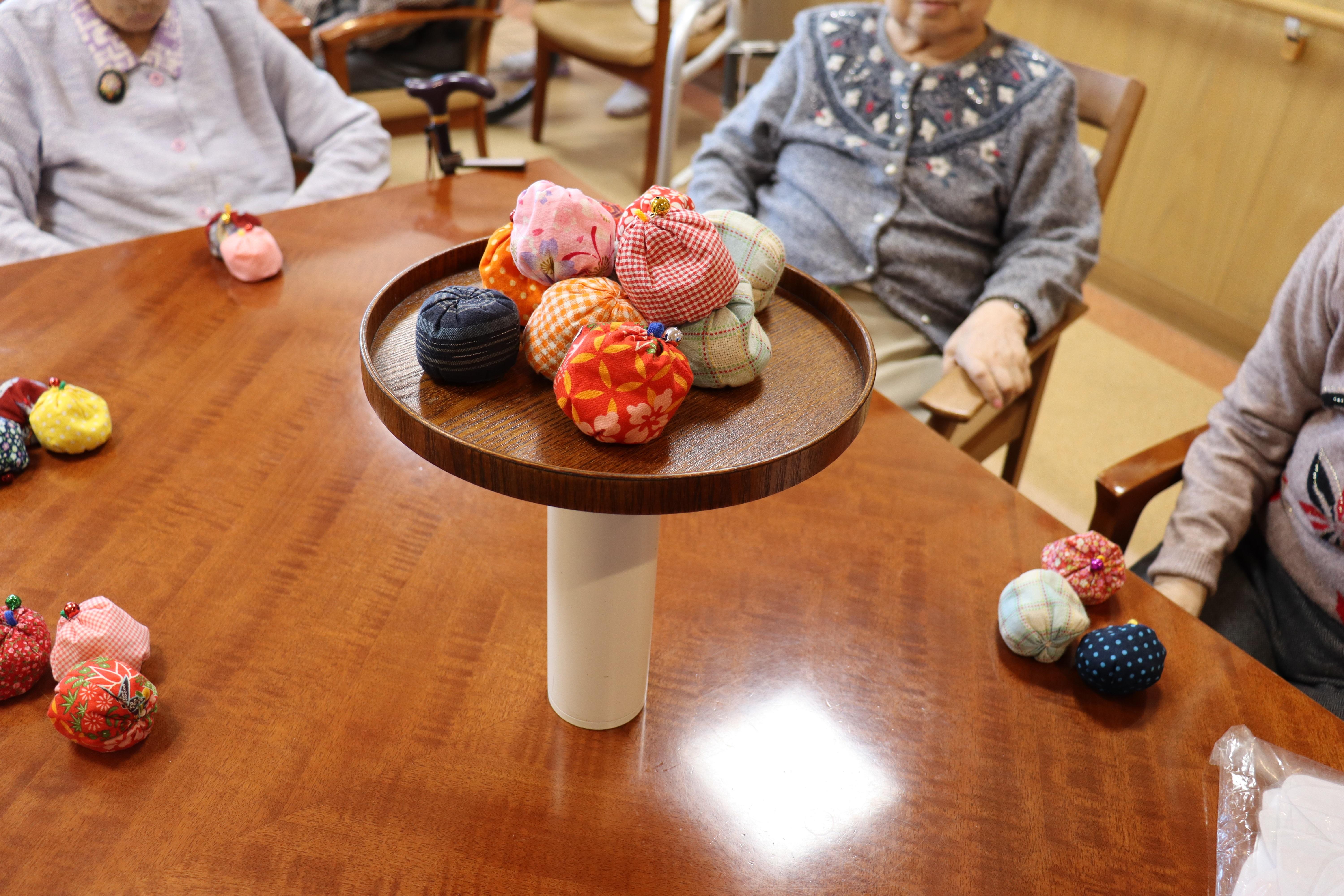 お手玉を使って楽しみながら機能訓練。筒の上に載せたお盆に、お手玉をのせていきます。バランスが悪いと筒からお盆が落下・・・ドキドキ感たっぷりです。