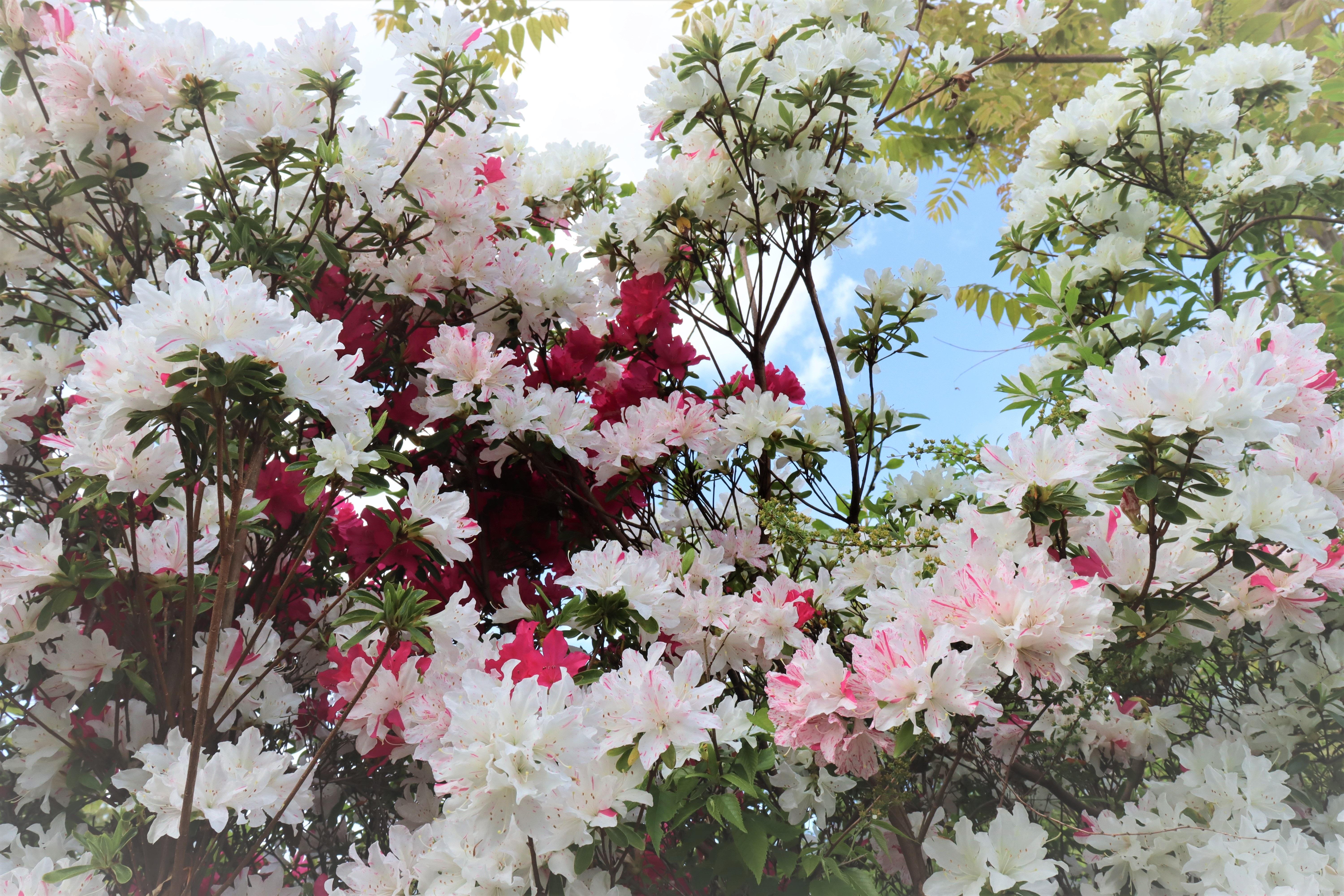 午後から雨予報なので、午前中の早い時間に日課のお散歩へ。ツツジが満開です。赤や白、ピンクと白が混ざっていたり・・・見事な美しさです。
