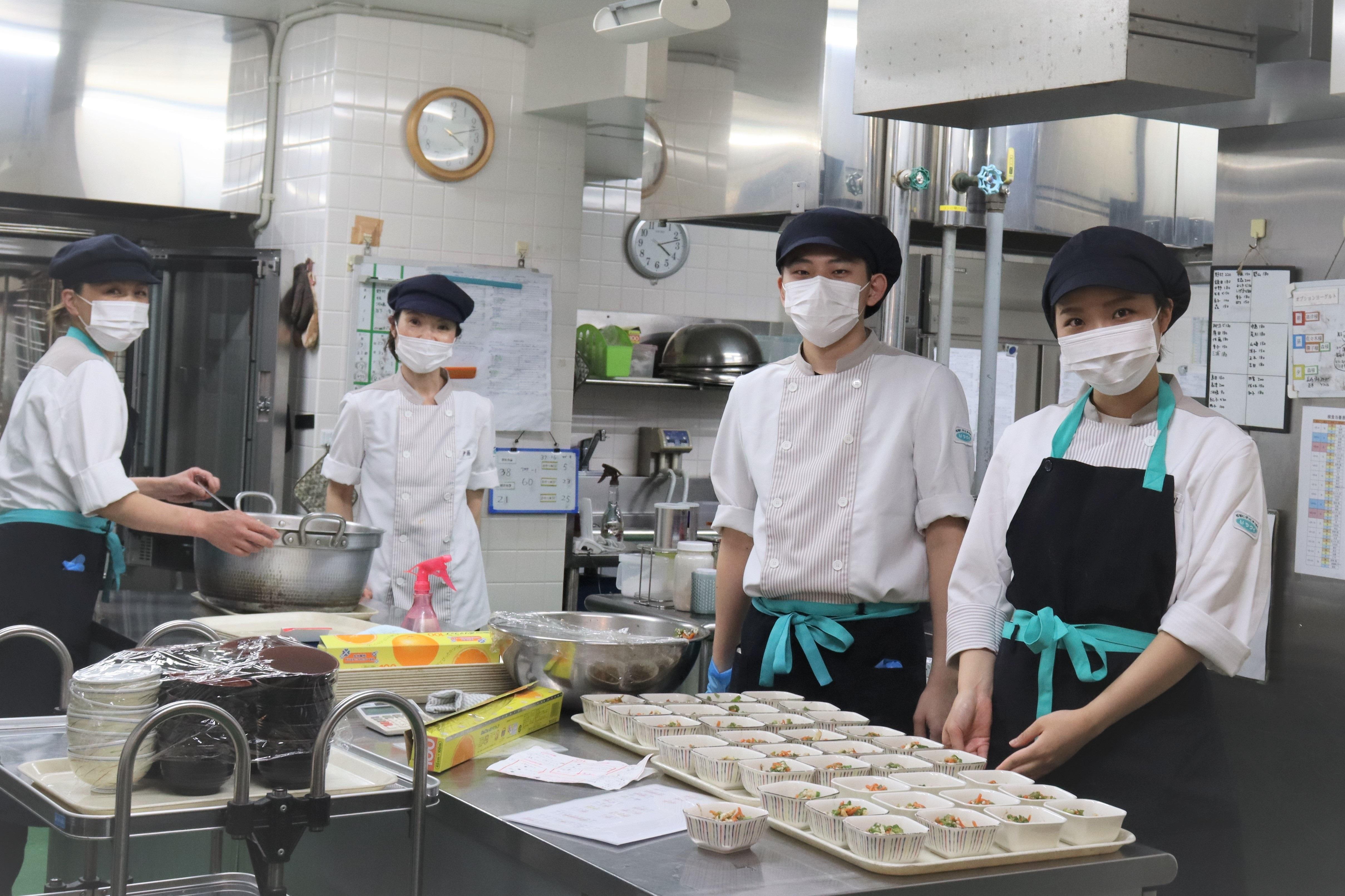 食堂に隣接している厨房で、作り立てをご提供しています。4月より新入社員も入社しました!「覚えることが沢山で大変ですが、毎日がとても楽しいです!」日々学びながら頑張っています。