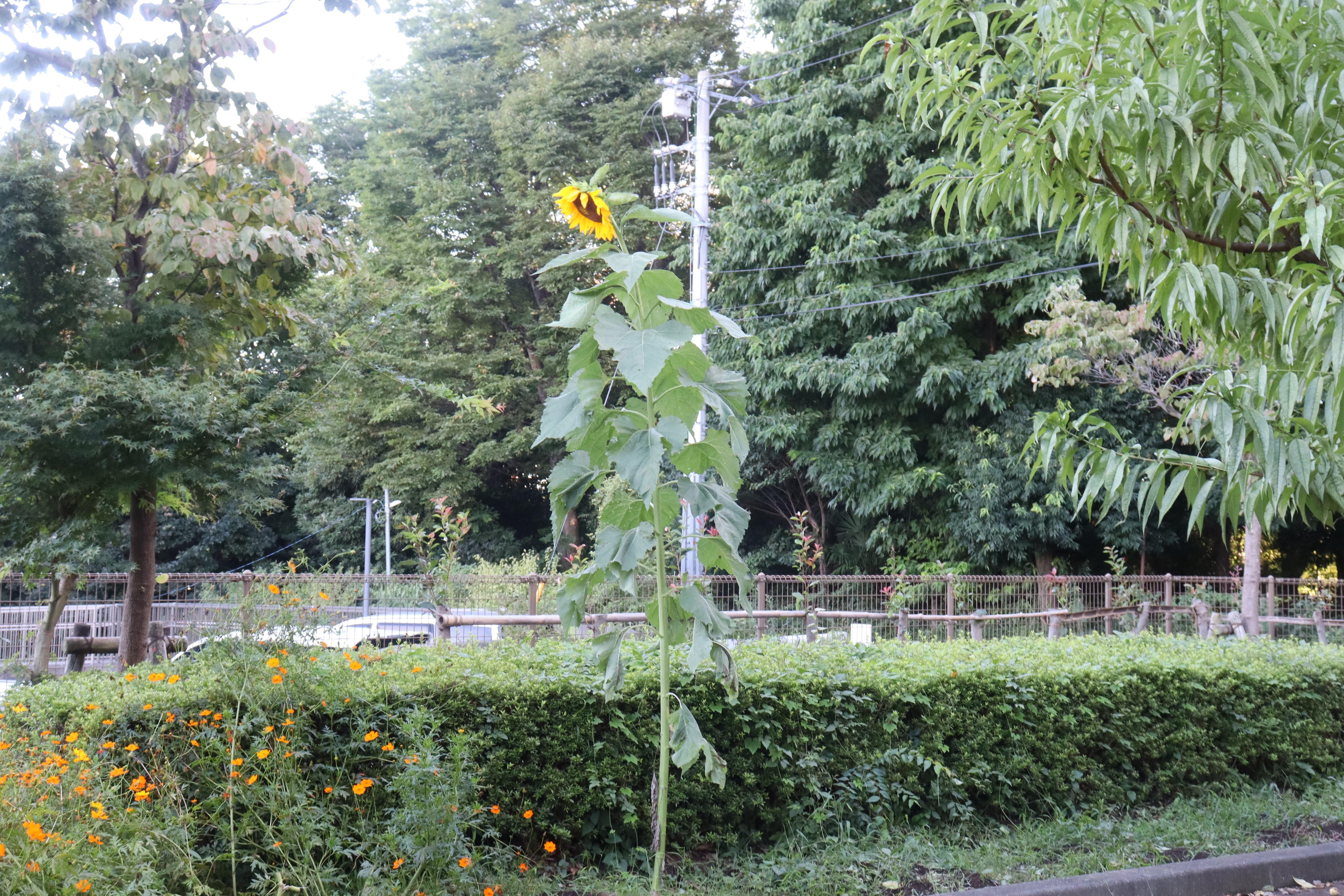 施設に隣接している野川泉公園へ。ぐんぐん伸びた〝ひまわり〟が、ようやく咲きました。その高さは2メートル超え、花が咲かないのでは・・・と夏の心配していました。やっと咲いたひまわりを見上げて笑顔!
